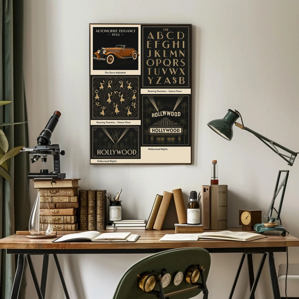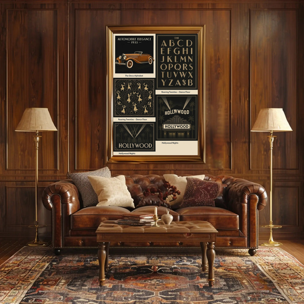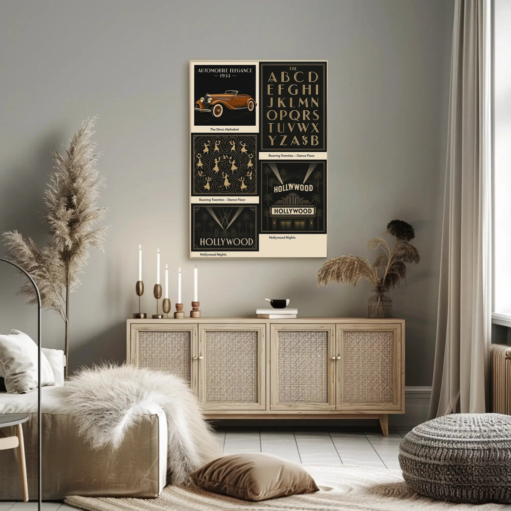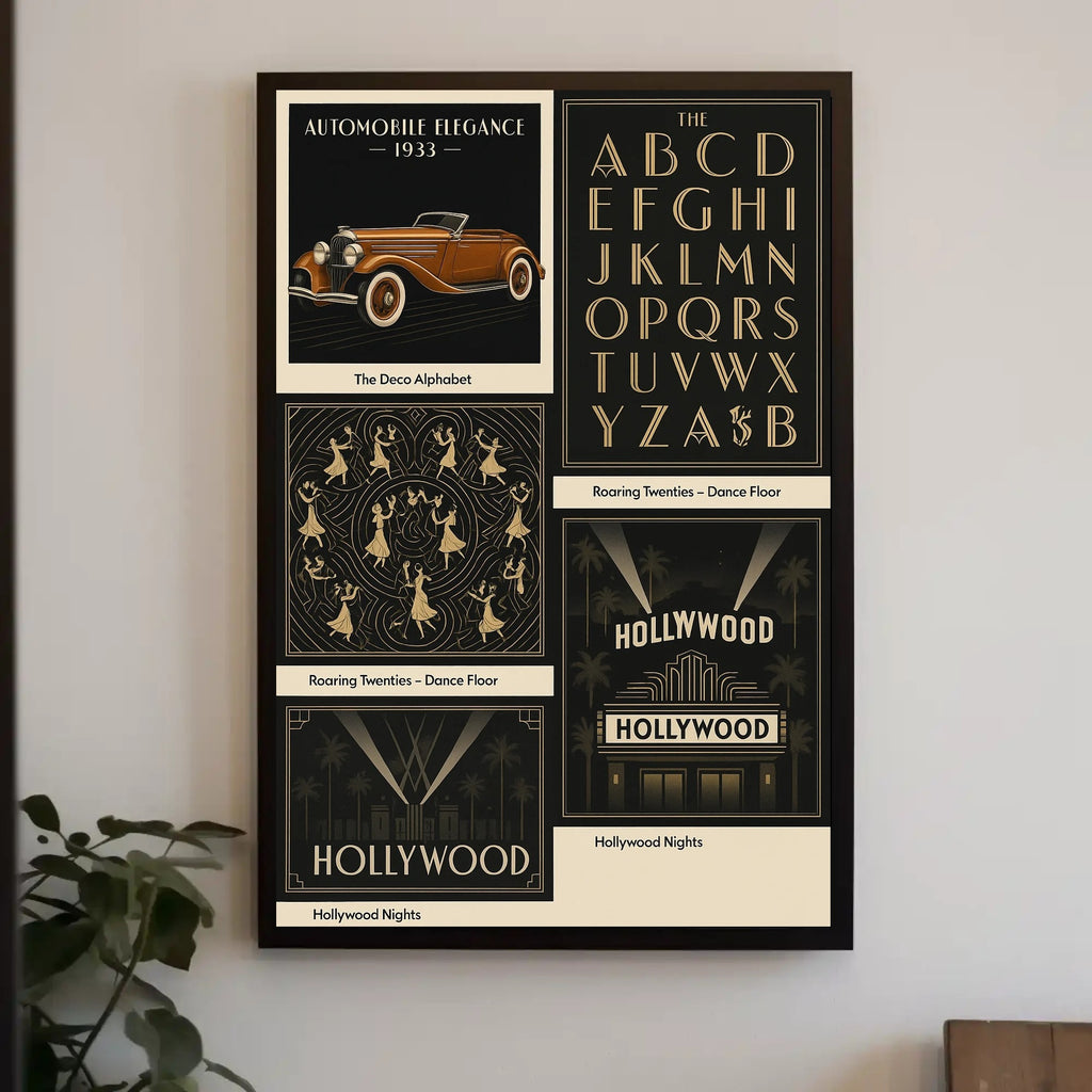 Step into the glamour of the Jazz Age with the Art Deco Elegance Roaring Twenties Cultural Poster from PosterGoat — a striking, museum-quality print that brings 1920s and 1930s sophistication to your walls. Rich black and cream tones, elegant gold-lined typography, and vintage-inspired illustrations (an Art Deco automobile, a stylized alphabet, swirling dance-floor figures and a classic Hollywood marquee) combine into a cohesive, nostalgic composition perfect for Home & Garden decor, artwork displays, and poster collections.