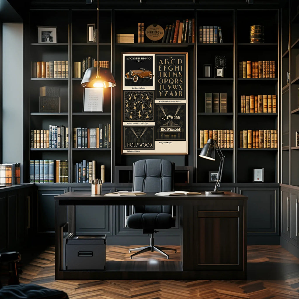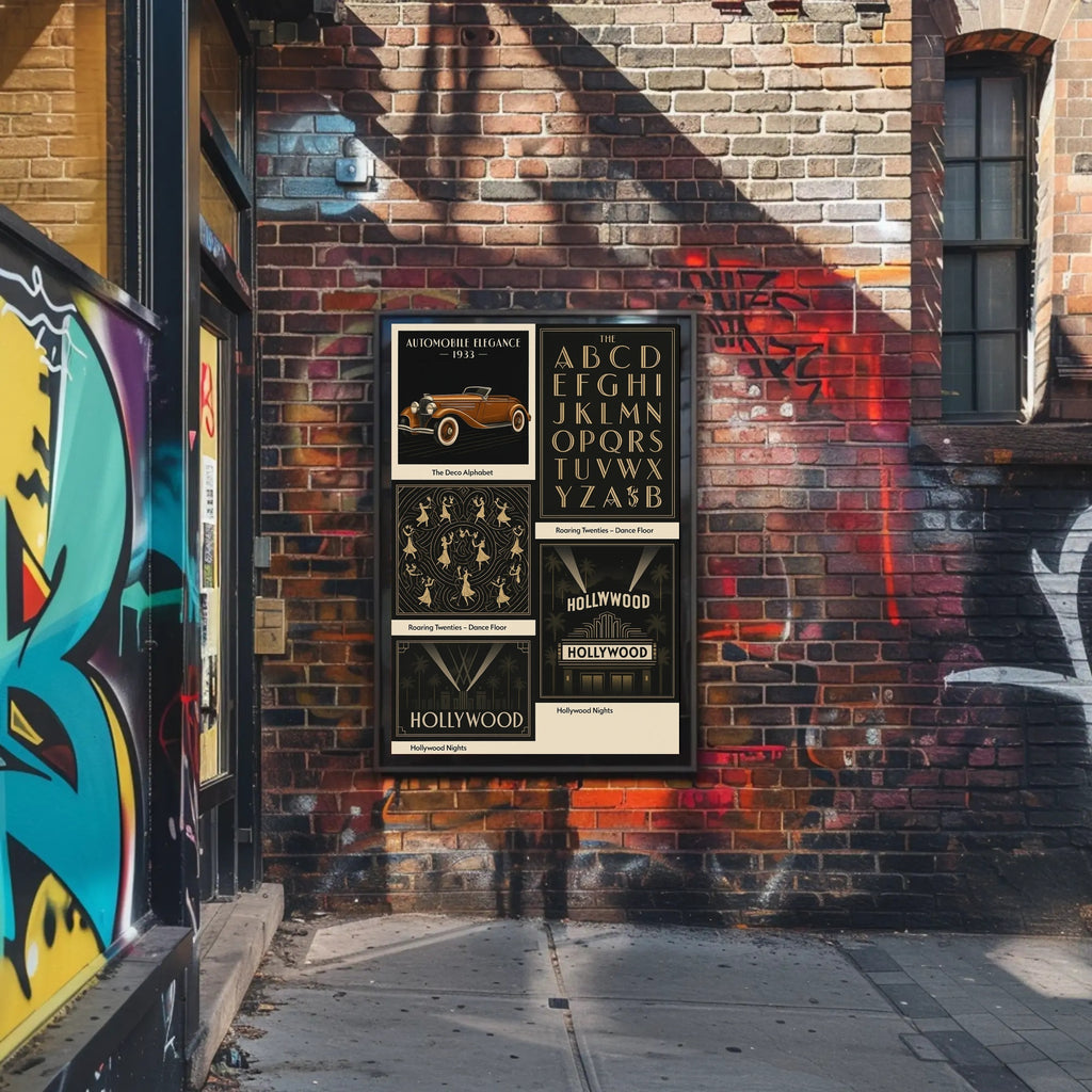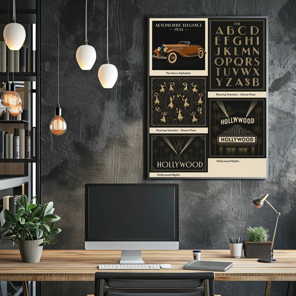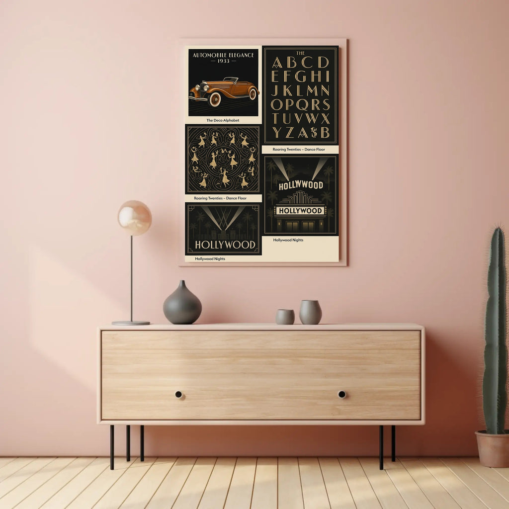 Step into the glamour of the Jazz Age with the Art Deco Elegance Roaring Twenties Cultural Poster from PosterGoat — a striking, museum-quality print that brings 1920s and 1930s sophistication to your walls. Rich black and cream tones, elegant gold-lined typography, and vintage-inspired illustrations (an Art Deco automobile, a stylized alphabet, swirling dance-floor figures and a classic Hollywood marquee) combine into a cohesive, nostalgic composition perfect for Home & Garden decor, artwork displays, and poster collections.
