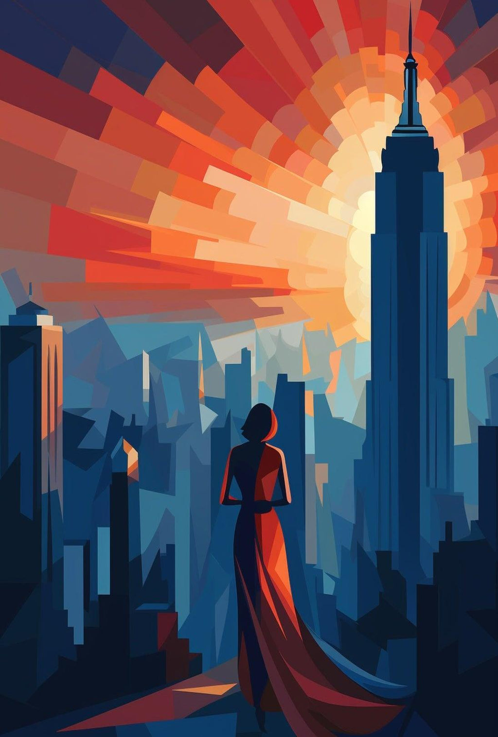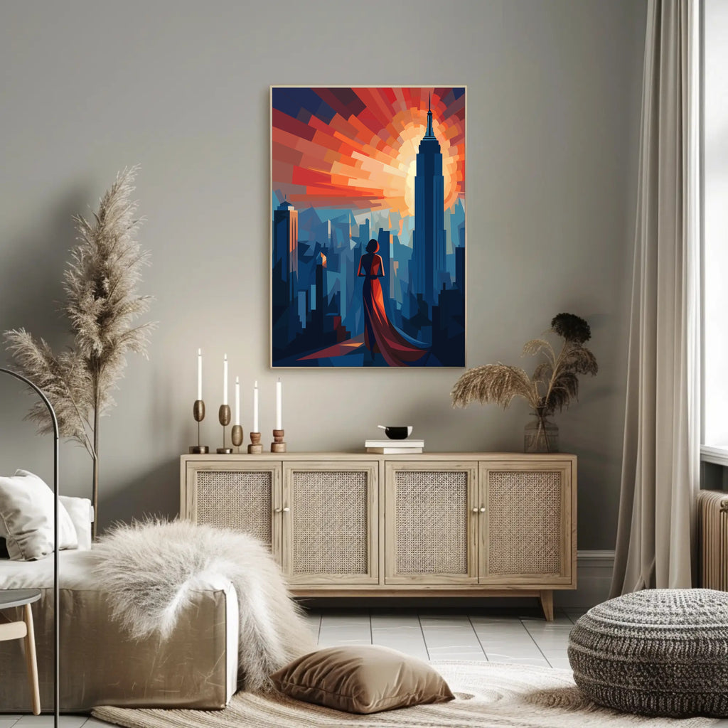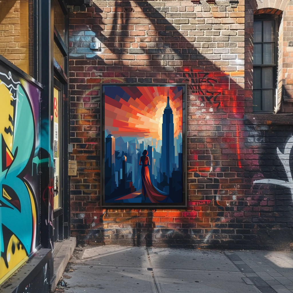 Bring the glamour of a bygone era into your home with the Art Deco New York Cityscape Elegance Travel Poster from PosterGoat. This striking 18x24 poster blends geometric Art Deco forms, dramatic sunburst colors and a silhouetted figure in an elegant gown to evoke the romance and scale of vintage New York travel art.