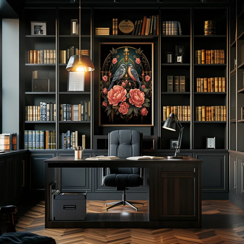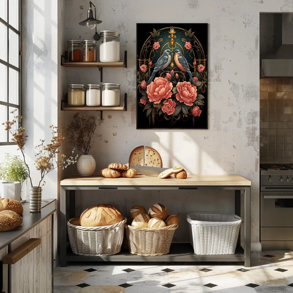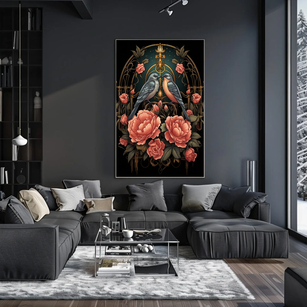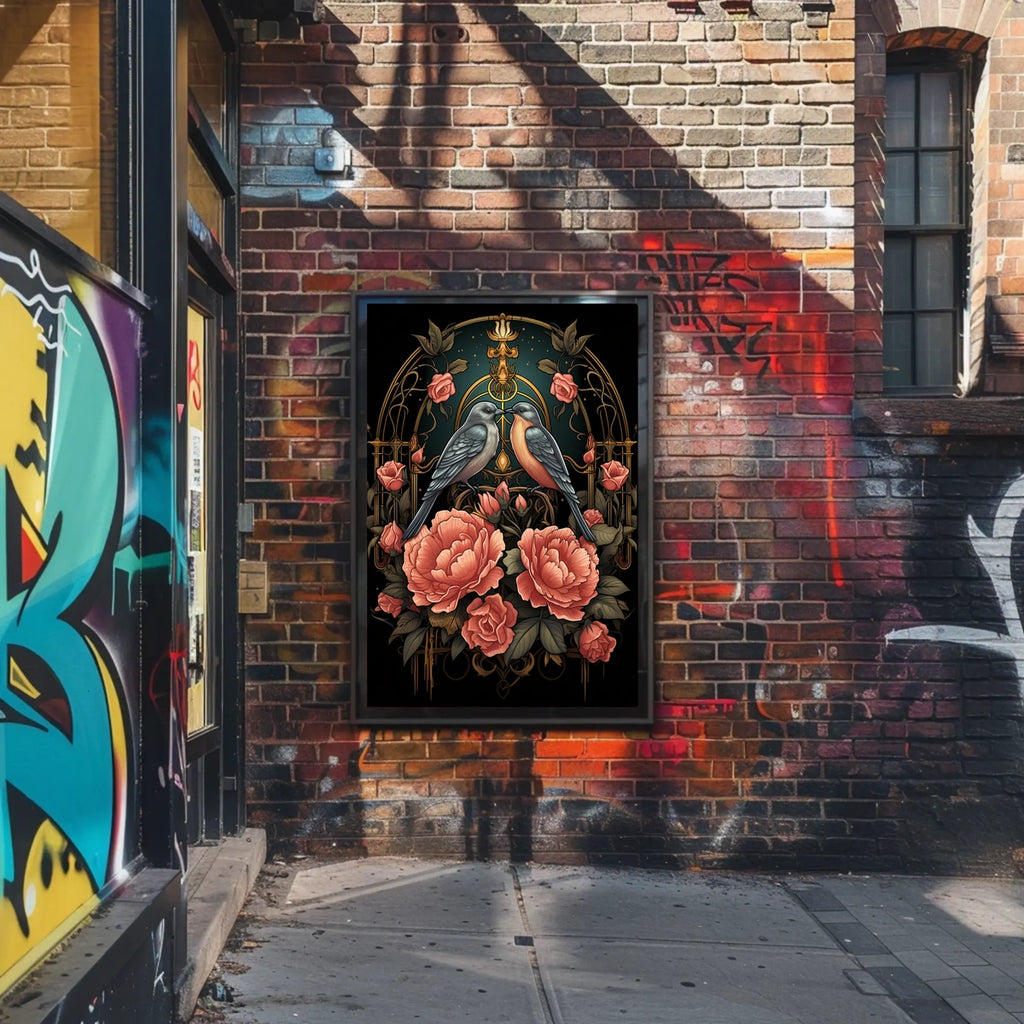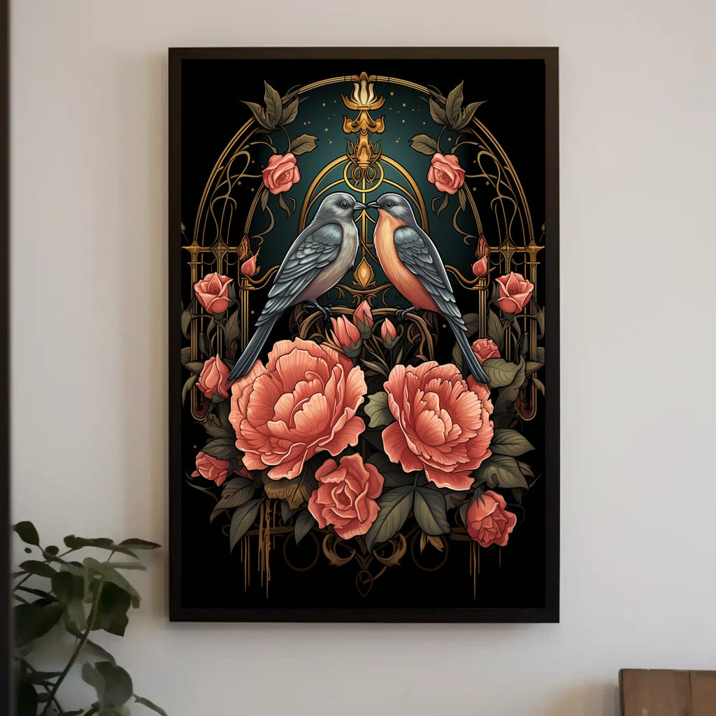 Immerse yourself in the enchanting world of Art Nouveau with this exquisite poster, showcasing two elegantly illustrated birds nestled among a lush bouquet of pink roses. The intricate design is set against a backdrop of swirling golden patterns and floral vines, embodying a harmonious blend of nature and artistry. The graceful curves and rich color palette of soft pinks, deep greens, and muted golds evoke a romantic and sophisticated ambiance. This piece captures the timeless beauty of early 20th-century art, making it a perfect addition for those who appreciate vintage elegance and nature-inspired decor.