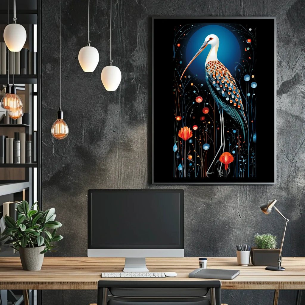 This modern abstract poster blends dreamlike art with enchanting style, creating a captivating focal point for any space. With vibrant colors and a surreal, whimsical design, it’s perfect for fans of bird illustration, floral elements, and contemporary wall decor.