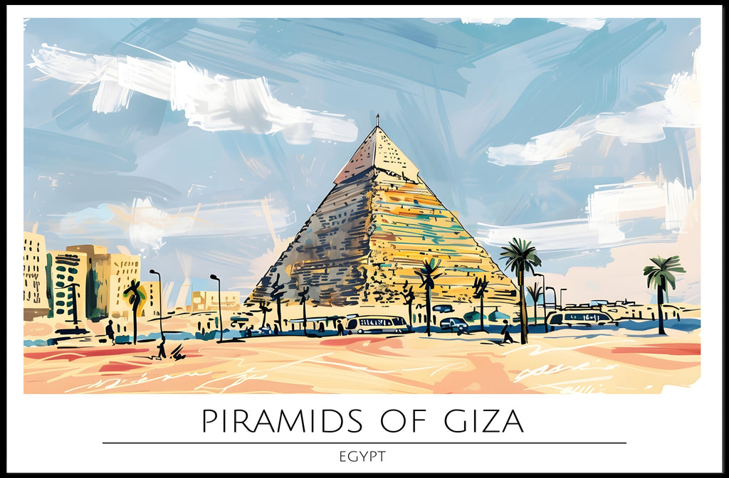 Bring ancient wonder into contemporary spaces with the Artistic Depiction of the Pyramids of Giza Poster from PosterGoat. This minimalist, travel-inspired art print reinterprets the Great Pyramid in loose, expressive brushstrokes—sun-warmed sands, a cloud-swept blue sky, and palm silhouettes blend with subtle city elements to create a scenic wall art piece that feels both historic and modern.