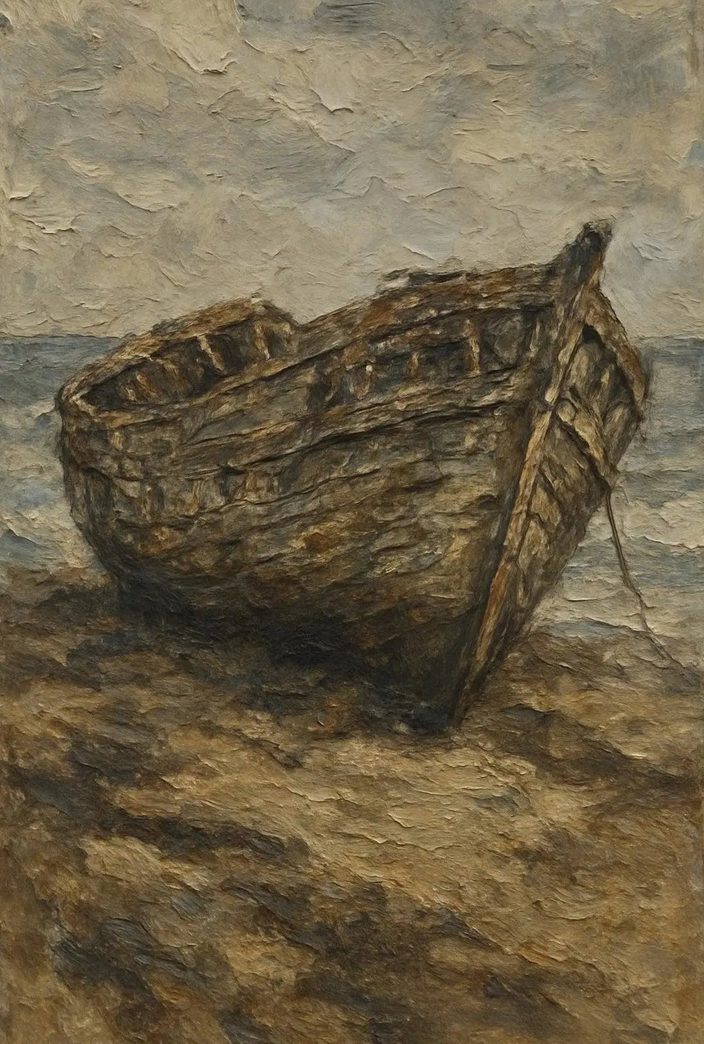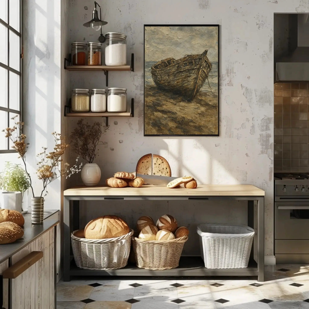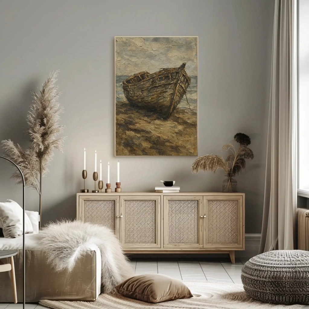 Bring a story of time-worn adventure into your home with the Artistic Shipwreck Poster from PosterGoat. This evocative poster depicts a weathered boat stranded on a quiet shore, rendered in an impressionistic, grunge-inspired style. The muted, earthy palette and richly textured brushwork create a contemplative focal point that complements coastal, vintage, and minimalist interiors.