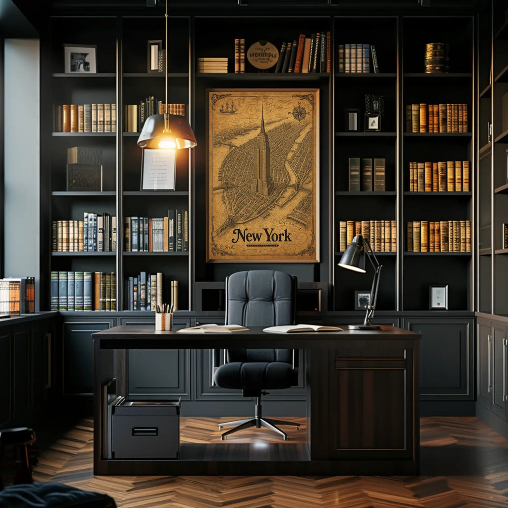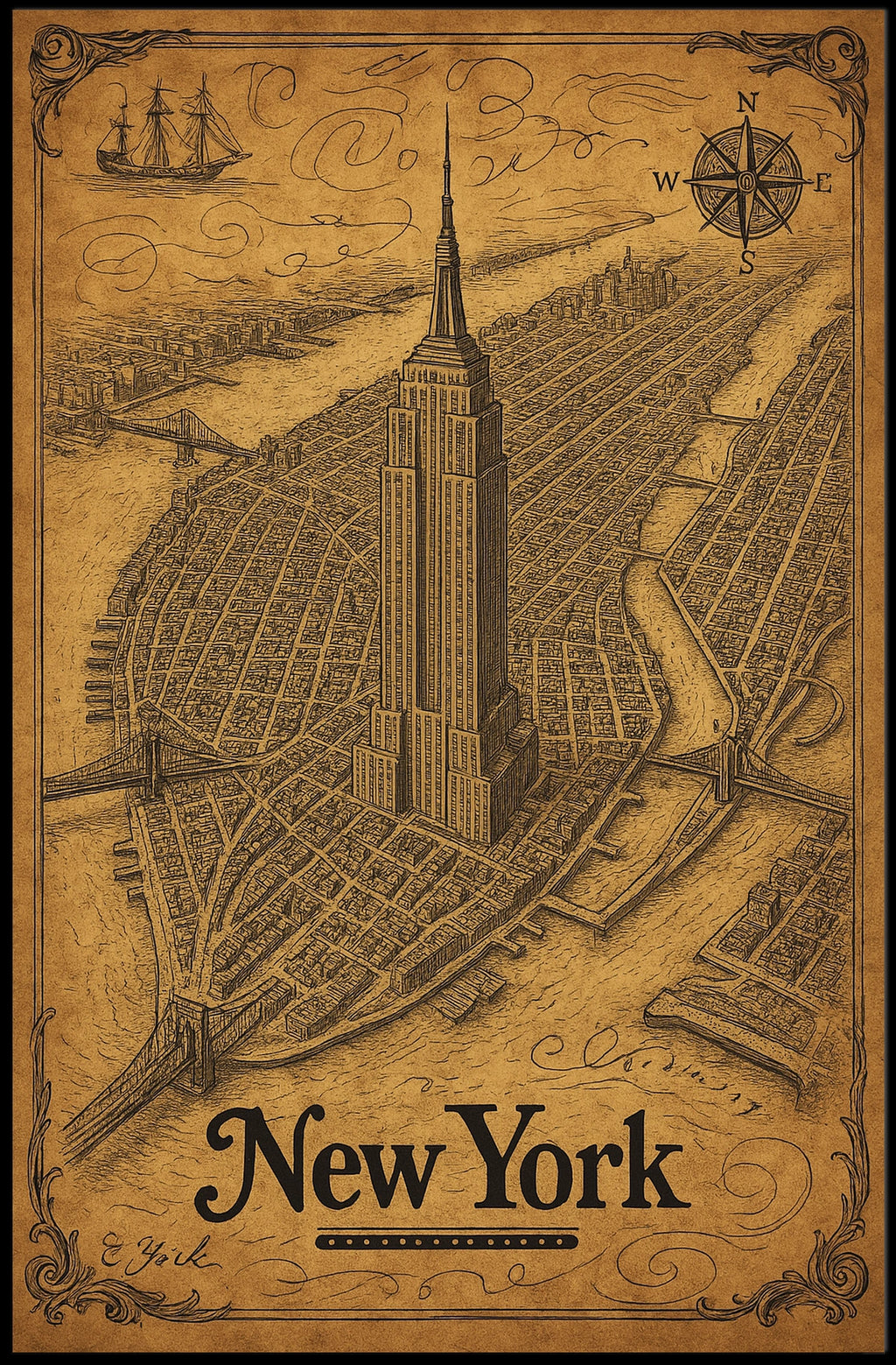 This poster captures the enduring charm of New York City through a vintage-style illustration of Manhattan's skyline. Hand-drawn lines echo antique cartography, elevating a familiar cityscape into a refined piece of art that invites everyday admiration and discussion.