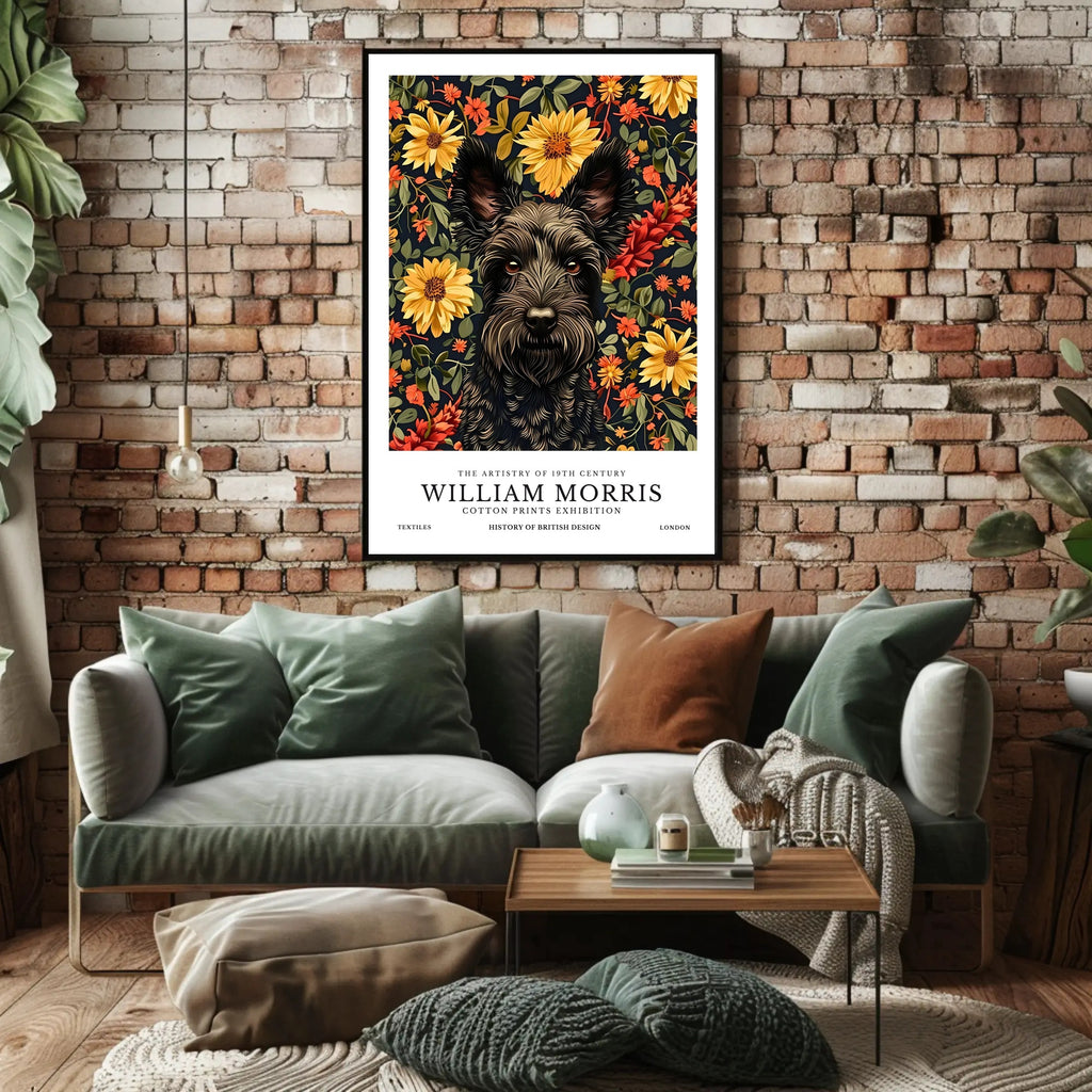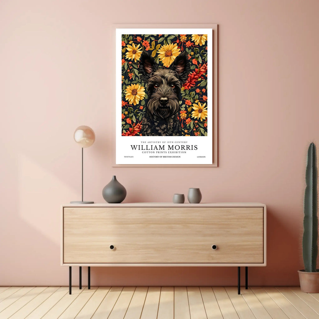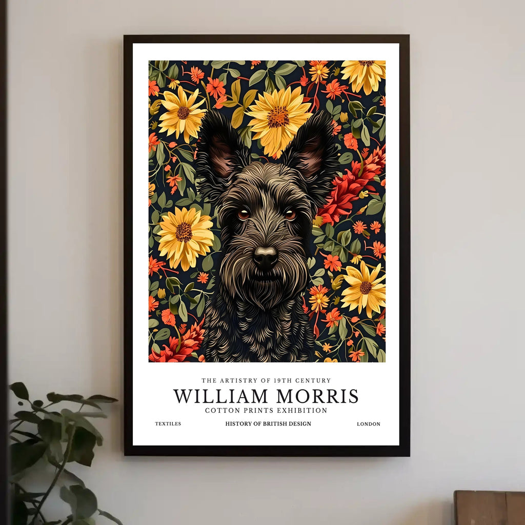 The Artistry of 19th Century with Floral Dog Artistic Poster from PosterGoat combines vintage charm with modern print quality — a striking poster that pairs a finely detailed dog illustration with lush William Morris–inspired floral patterns. Rich sunflowers and warm autumn blooms sit against a deep, elegant background while the textured fur and expressive eyes of the dog create an immediate focal point for any room.