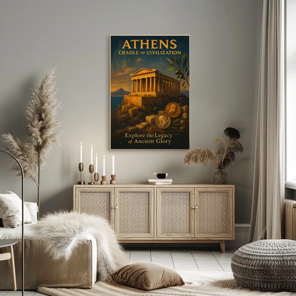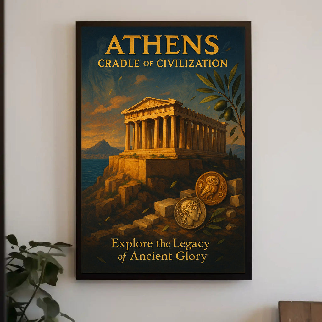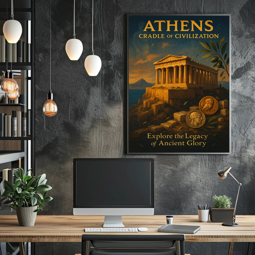 Athens Parthenon Vintage Art Cultural or Heritage Poster — a timeless tribute to the cradle of Western civilization. This PosterGoat print captures the Parthenon's commanding silhouette atop rugged cliffs, framed by an olive branch and historic coin motifs that echo ancient Greek culture and classical style.