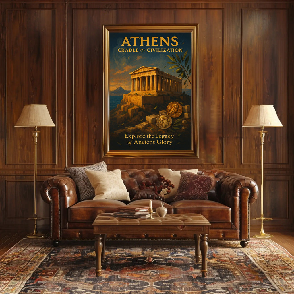 - Iconic imagery: Detailed depiction of the Parthenon with a distant coastal horizon, evoking Athens’ historical and architectural legacy.