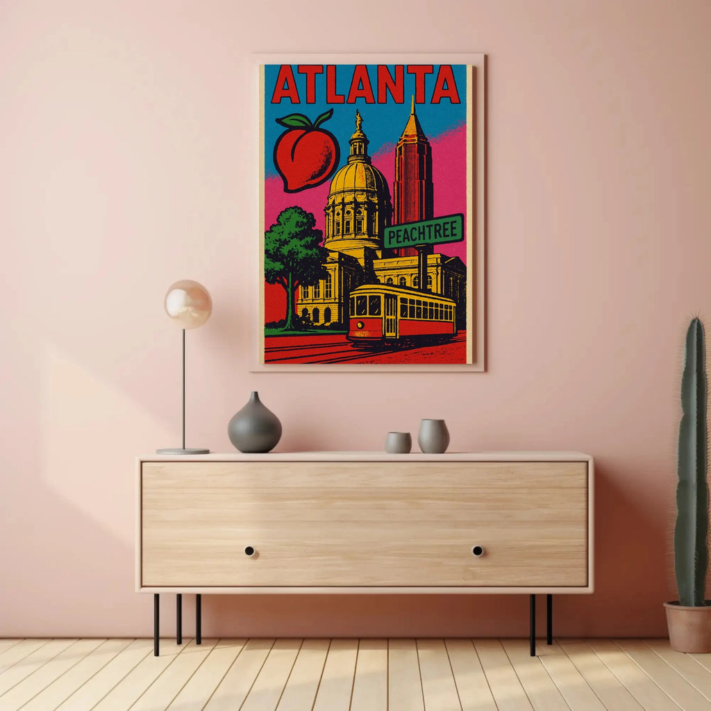 Capture the spirit of Georgia's capital with the Atlanta Peachtree Vintage Style Travel Poster from PosterGoat — a vibrant, retro-inspired print that blends bold outlines, nostalgic color-blocking, and iconic city imagery for a statement piece in any home or office.