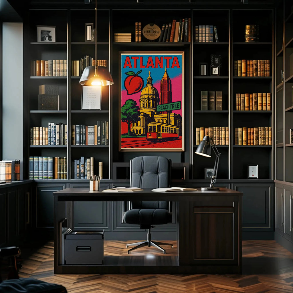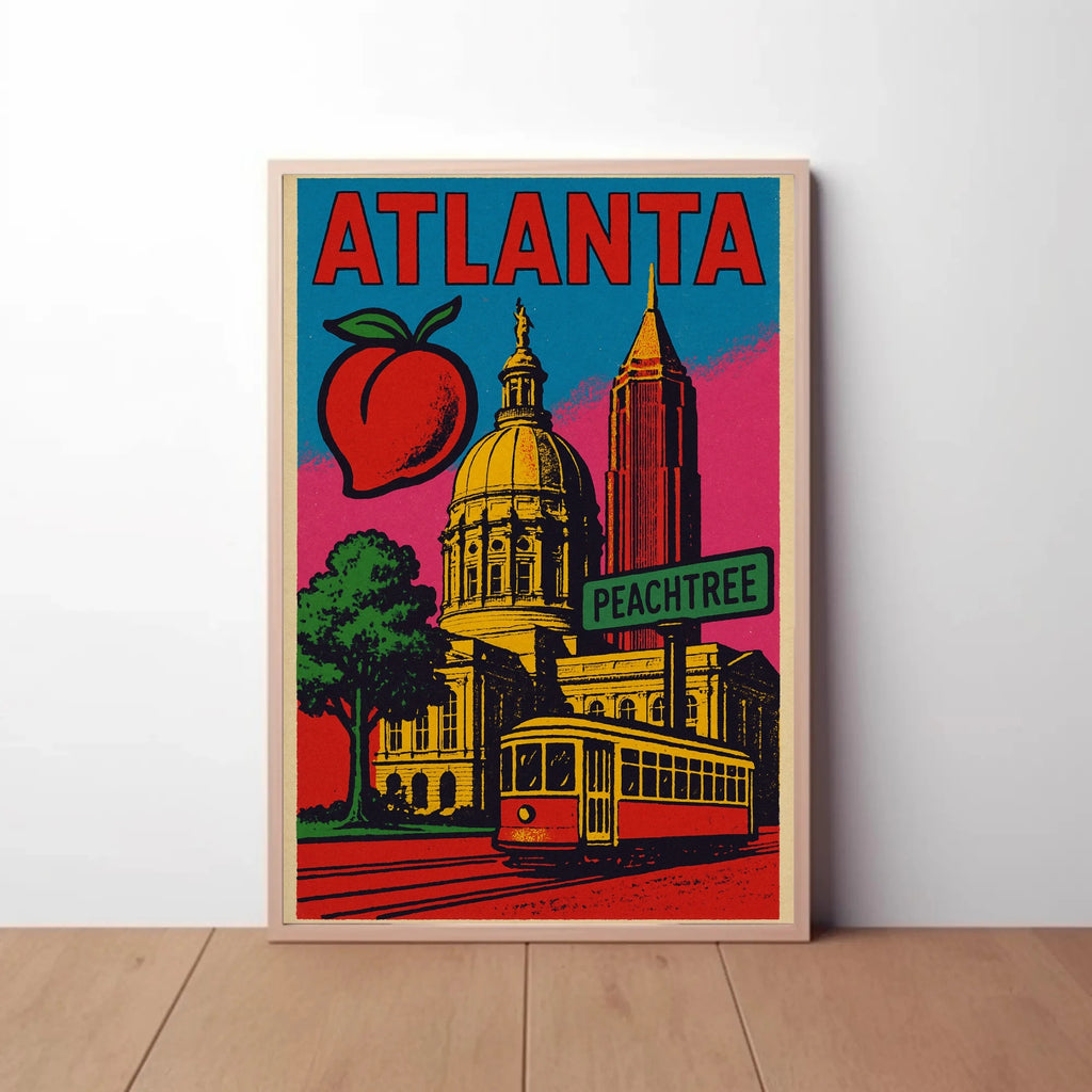This Atlanta poster merges nostalgic charm with contemporary color and texture, making it an eye-catching focal point that celebrates the Peach State. It works beautifully as a single focal print or as part of a curated gallery wall featuring urban art and vintage travel memorabilia.