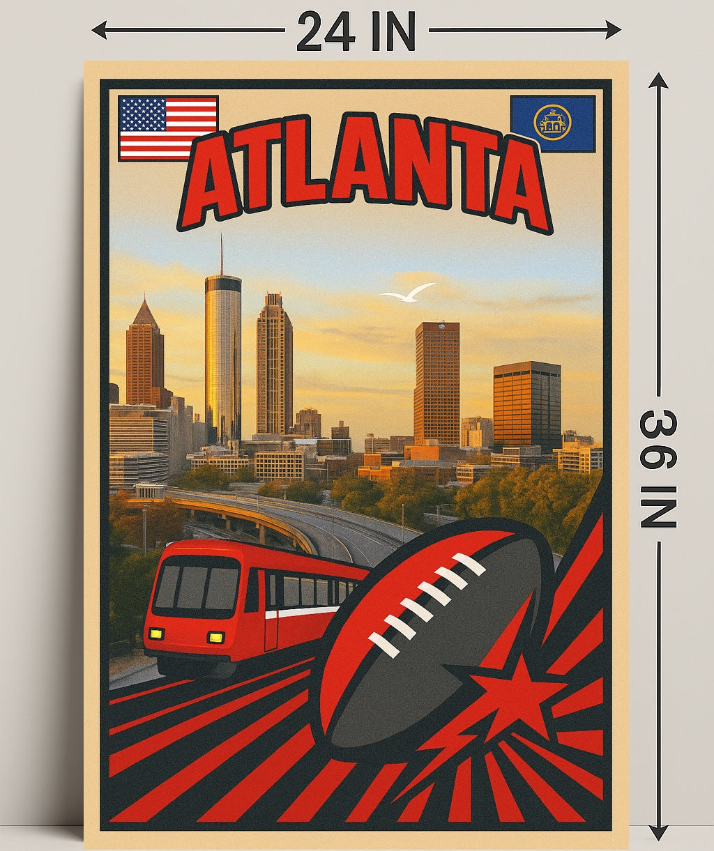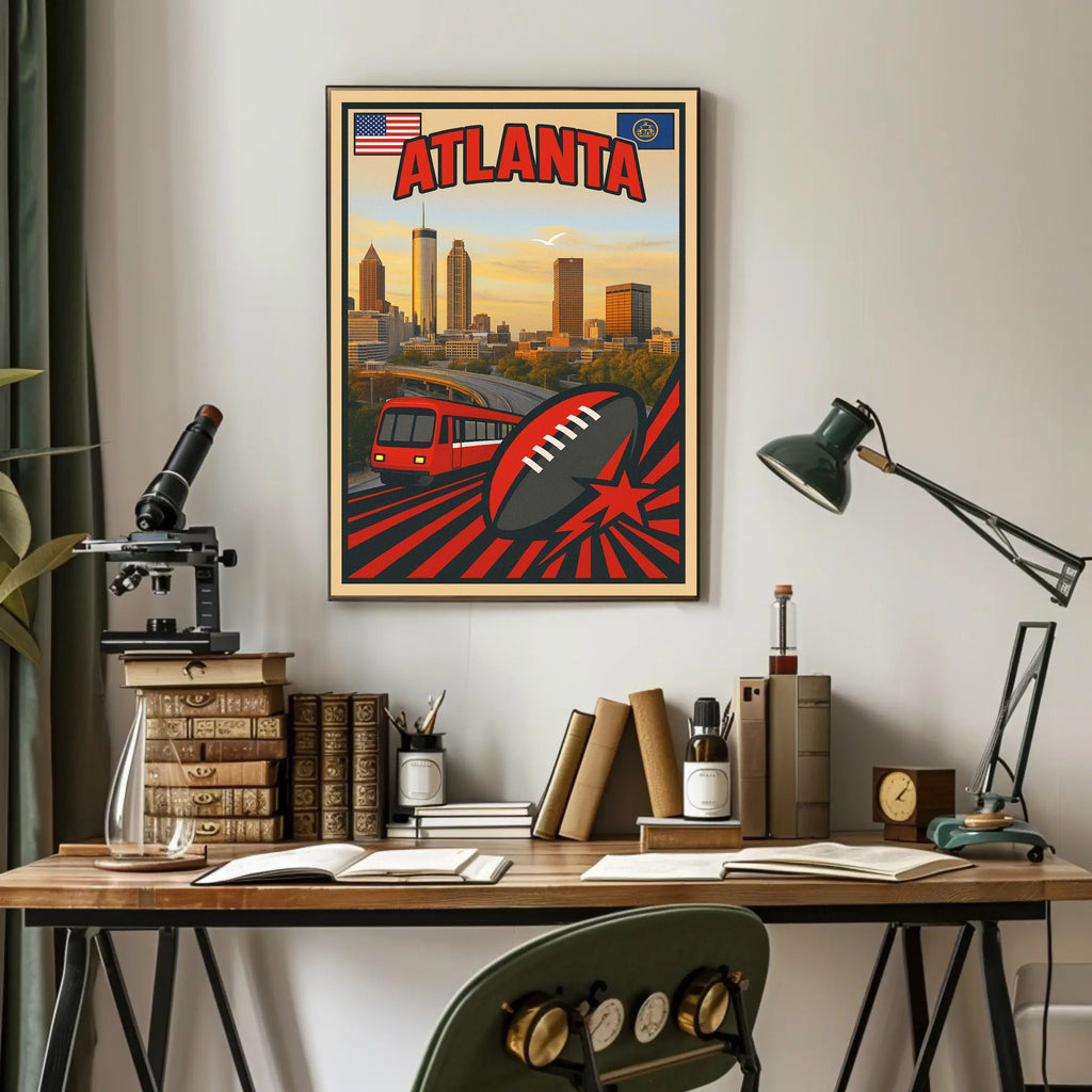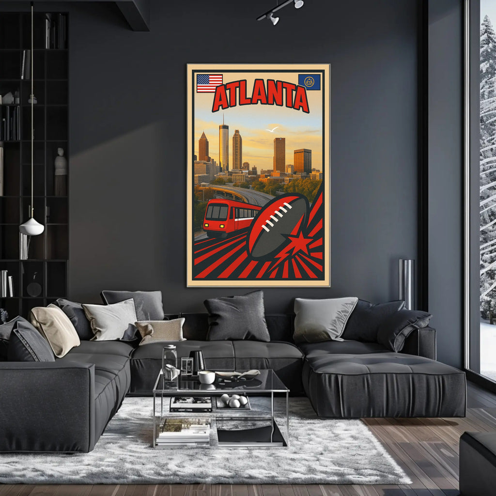 Striking visual composition: A warm sunset skyline of Atlanta anchors the top of the print while a dynamic red train and oversized football graphic create movement and excitement in the foreground.