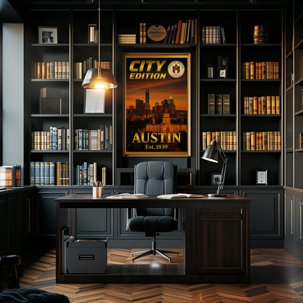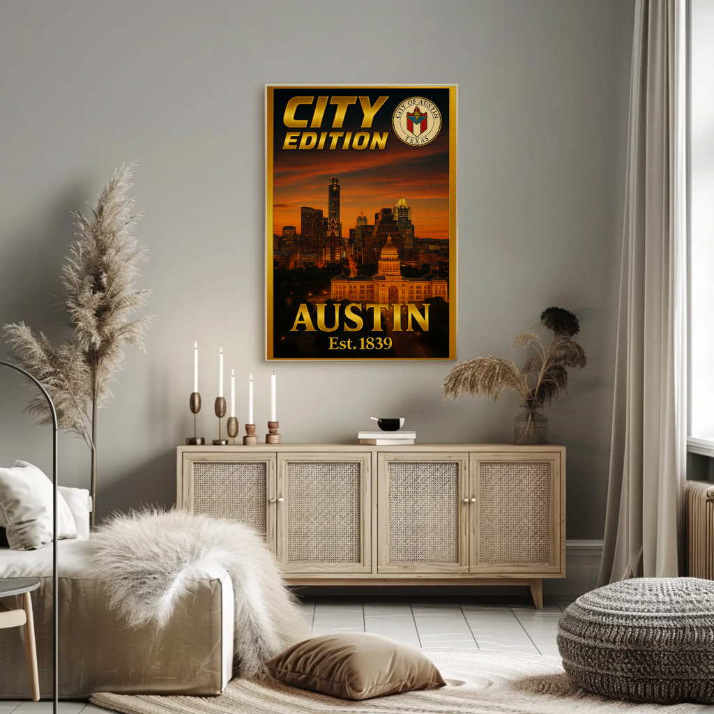 Whether you’re decorating a home, gifting a Texan souvenir, or curating a cityscape print collection, this Austin skyline poster adds warmth, elegance, and a sense of place. The bold “CITY EDITION” title and tasteful gold accents create an upscale, collectible feel that complements contemporary interiors.