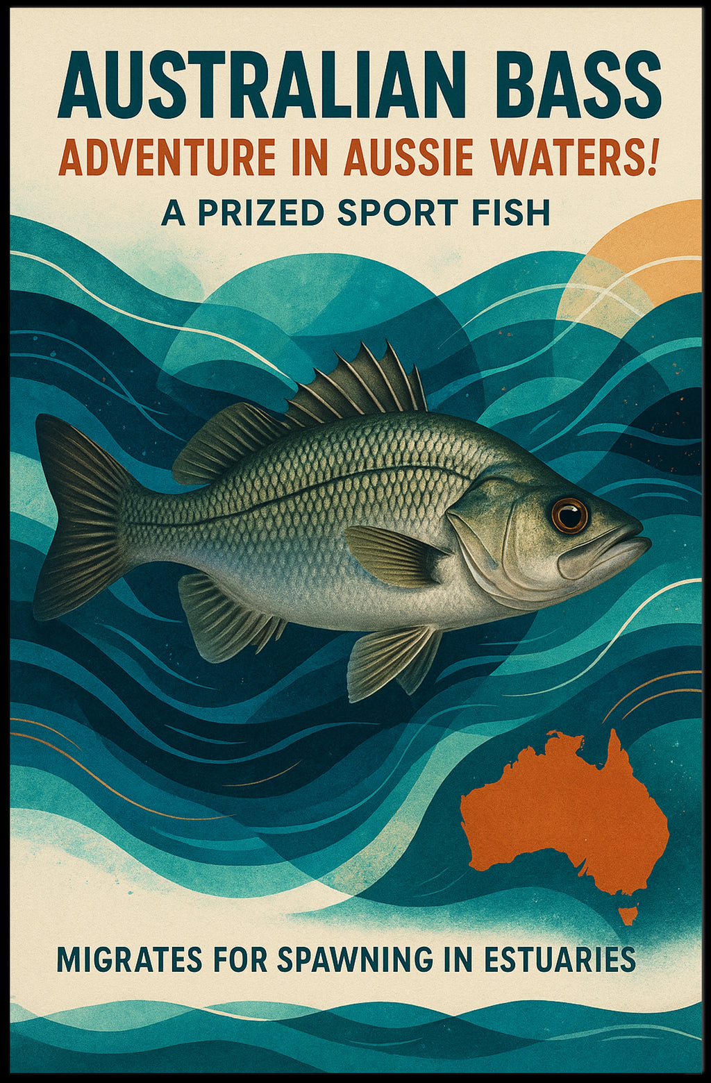 Bring the thrill of angling and coastal adventure into your home with the Australian Bass Adventure Sport Fishing poster by PosterGoat. This striking pop-art inspired print showcases a beautifully detailed Australian Bass set against dynamic teal waves and a warm, earthy palette—an eye-catching piece perfect for fishing enthusiasts, nautical decor lovers, and anyone who appreciates classic vintage-inspired artwork.