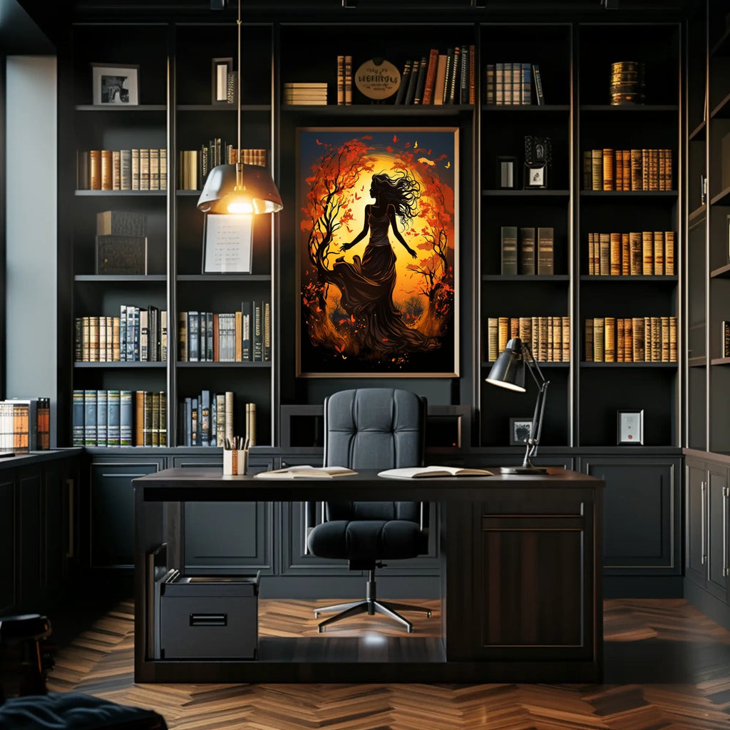 - Printed with precision and made to inspire, this artwork is more than decoration—it’s a conversation piece that connects nature, art, and the energy of the season. Bring Autumn Dance: Silhouetted Woman in Vibrant Landscape into your home, classroom, or office today and let your walls tell a powerful story.