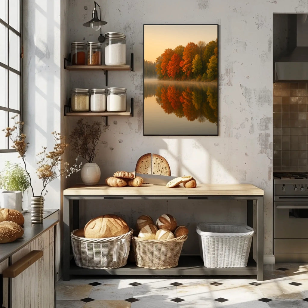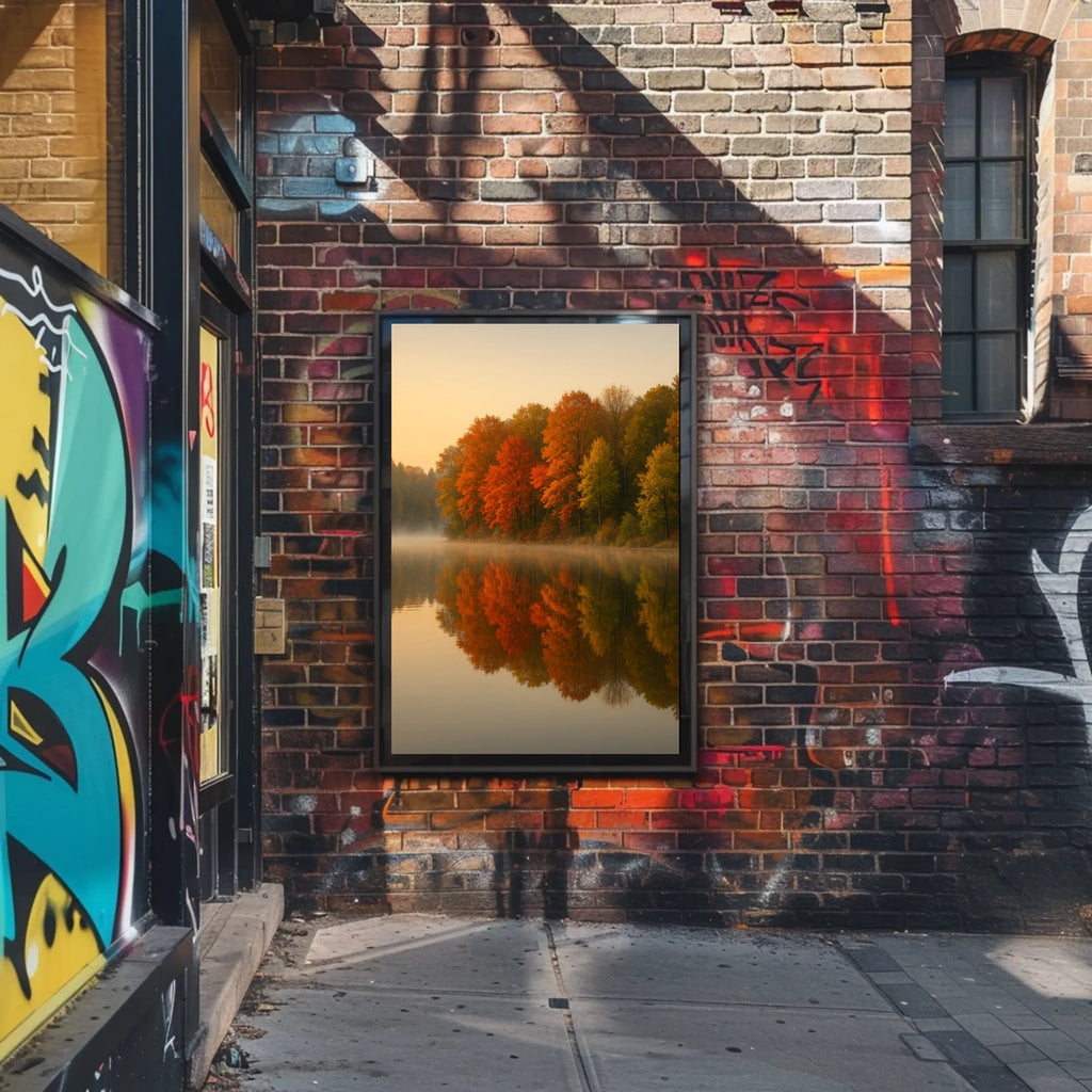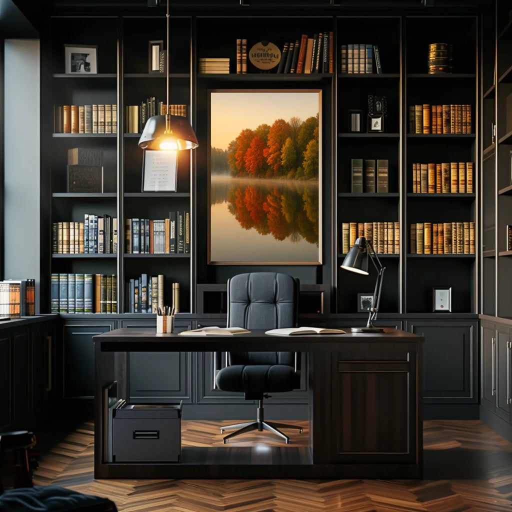 This artwork captures the essence of autumn's tranquility, making it a perfect addition to any space seeking to evoke the natural world's serene beauty and atmospheric charm.