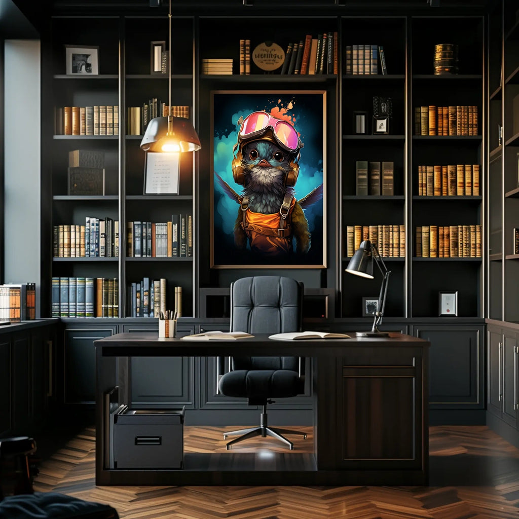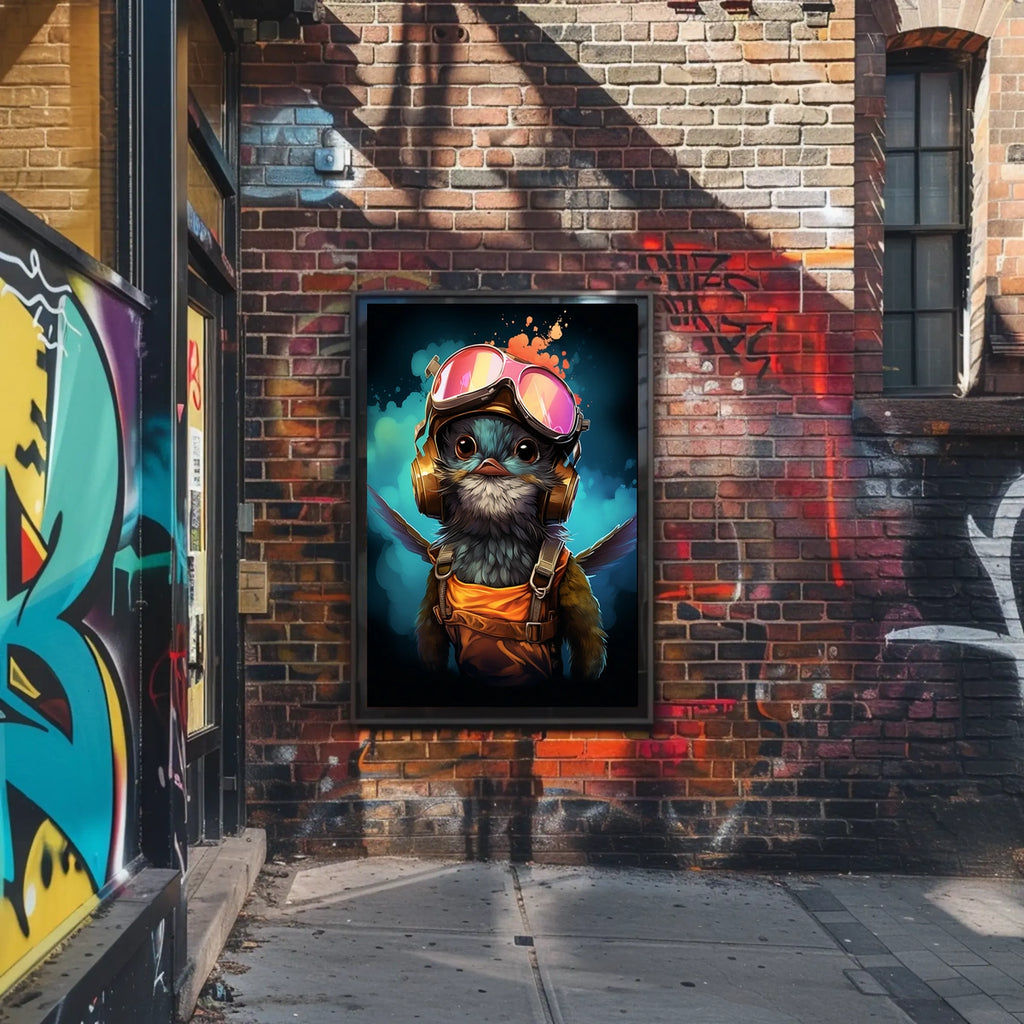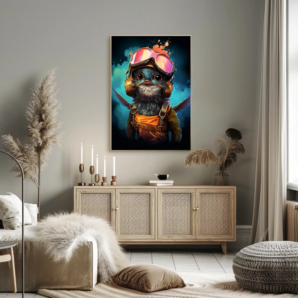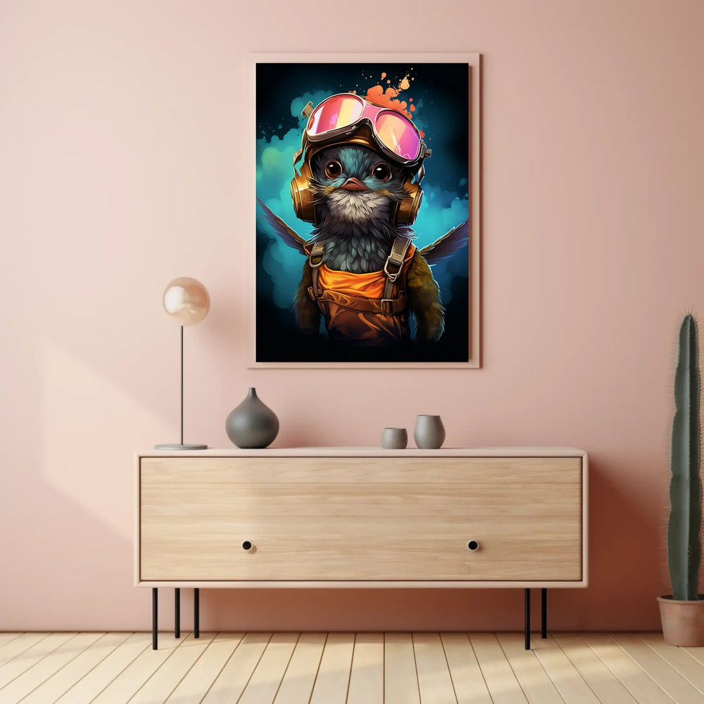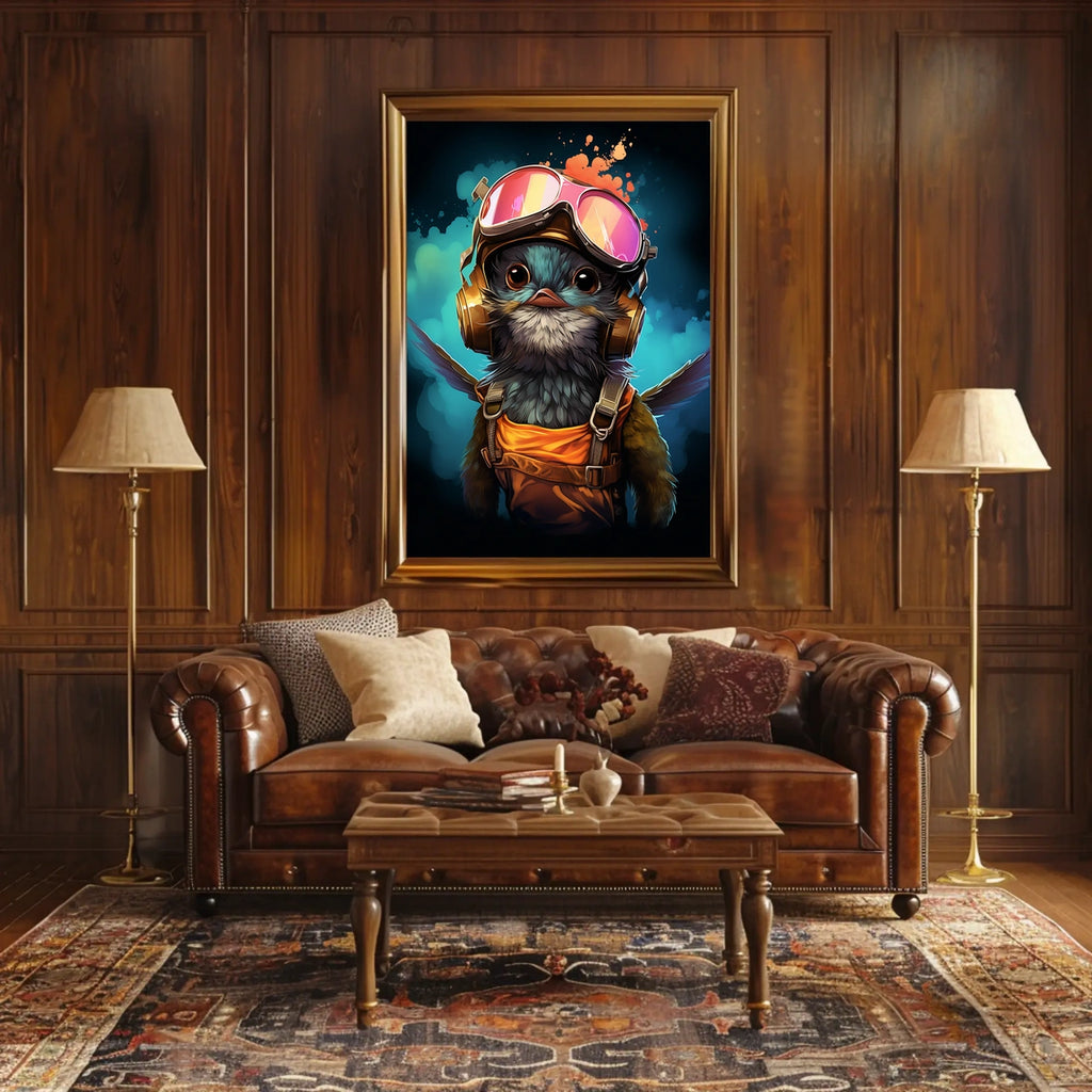 Step into a whimsical sky with Aviator Dreams, a vibrant poster that spotlights a fearless bird in a daring aviator outfit. Colorful goggles, a confident stance, and playful charm invite imagination, turning walls into a launchpad for adventure in any kids' space. Designed to brighten any space and inspire endless adventures.