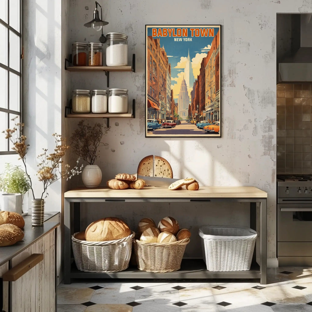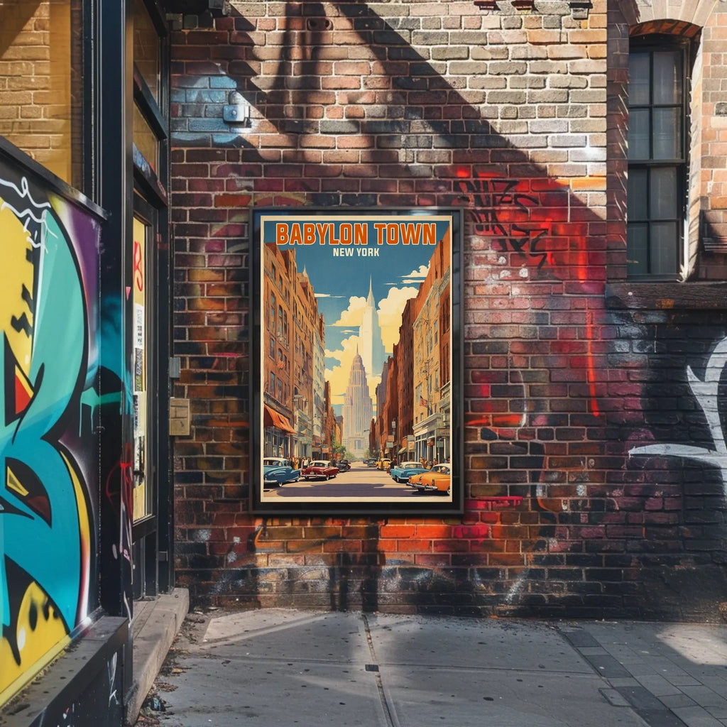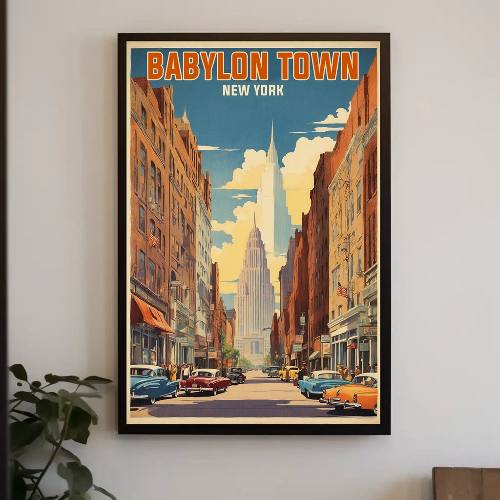 Step into a bygone era with the Babylon Town New York Urban Cityscape Poster, a vivid homage to mid-century Manhattan. This striking print captures the energy of 1950s streets—classic architecture, vintage cars, and a bold skyline—bringing nostalgic charm and urban sophistication to any room.