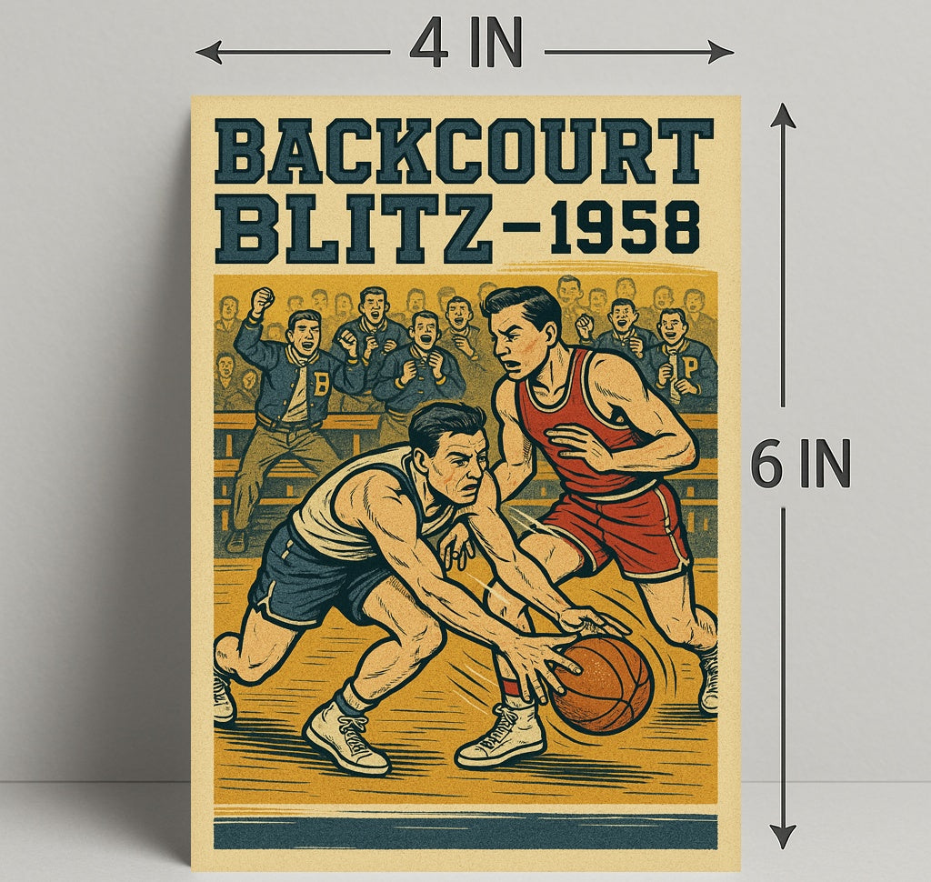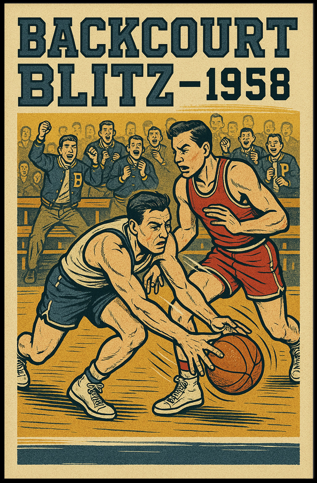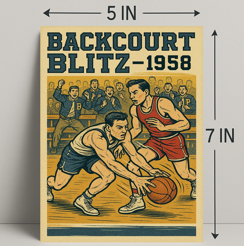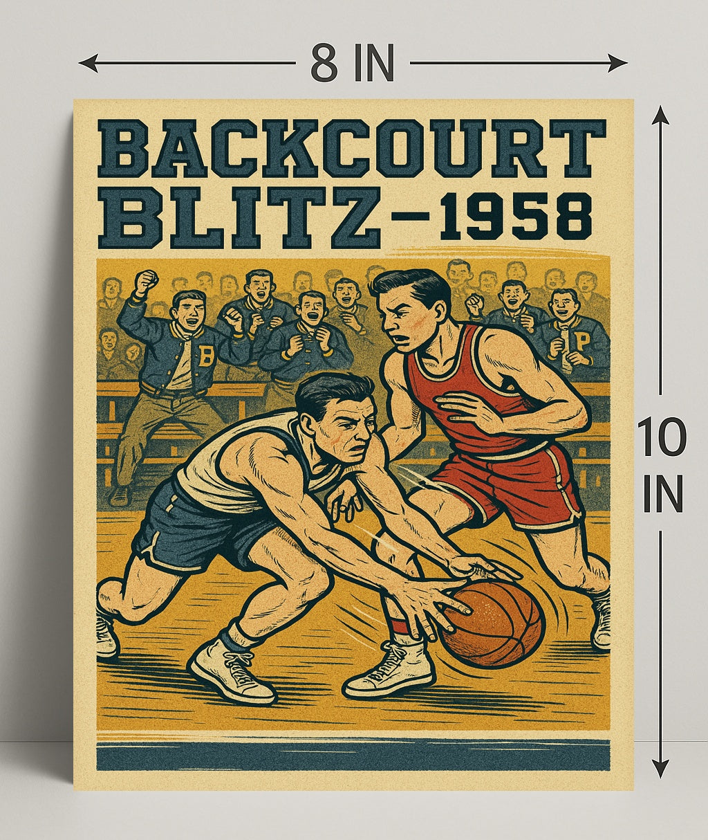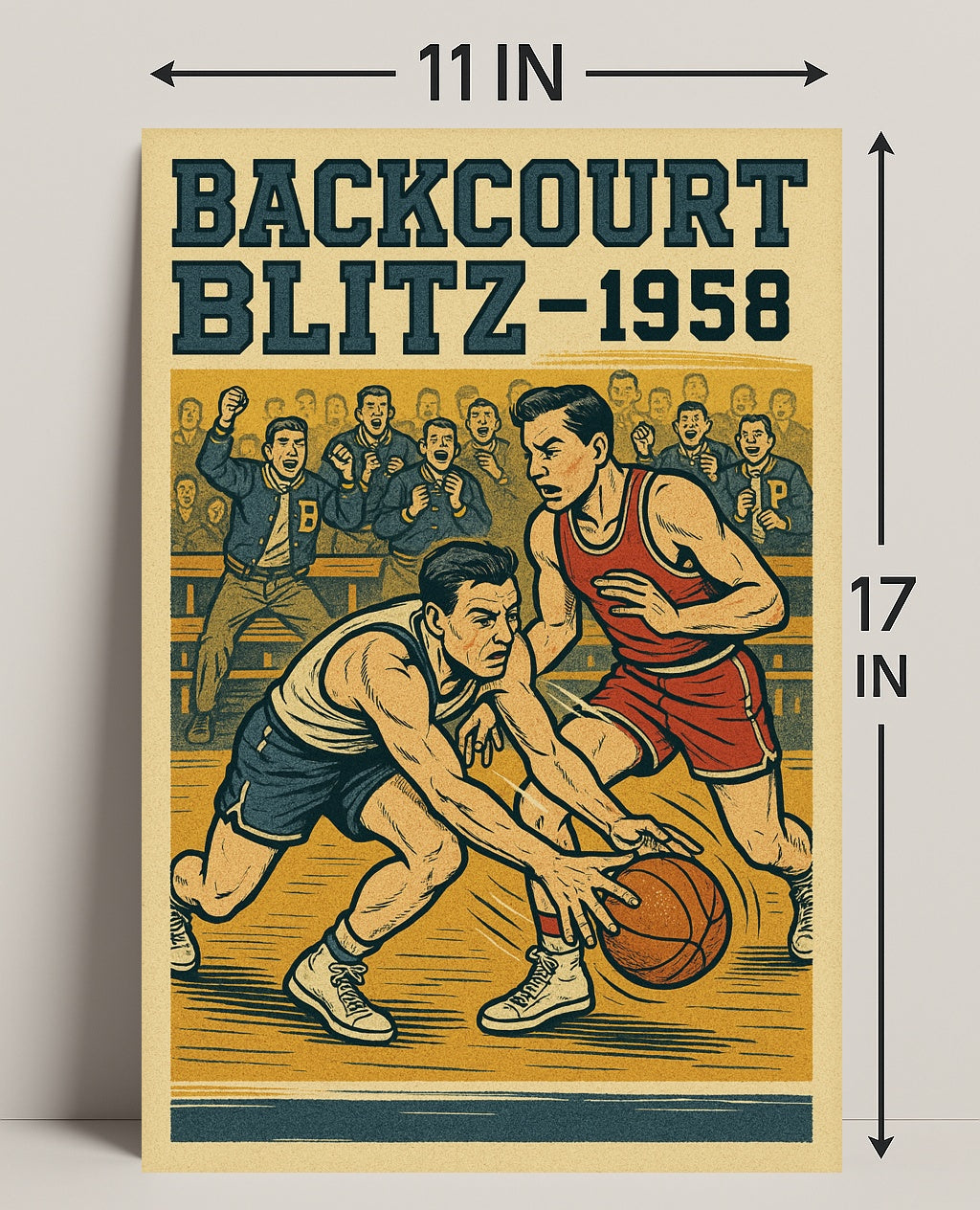 Elevate your decor with the Backcourt Blitz 1958 Vintage Sports Poster and celebrate the rich history of basketball. Don't miss your chance to own this iconic piece of artβorder yours today and bring a piece of athletic nostalgia into your home!