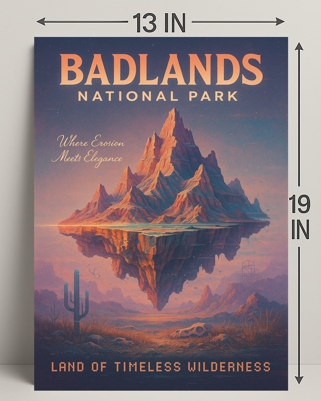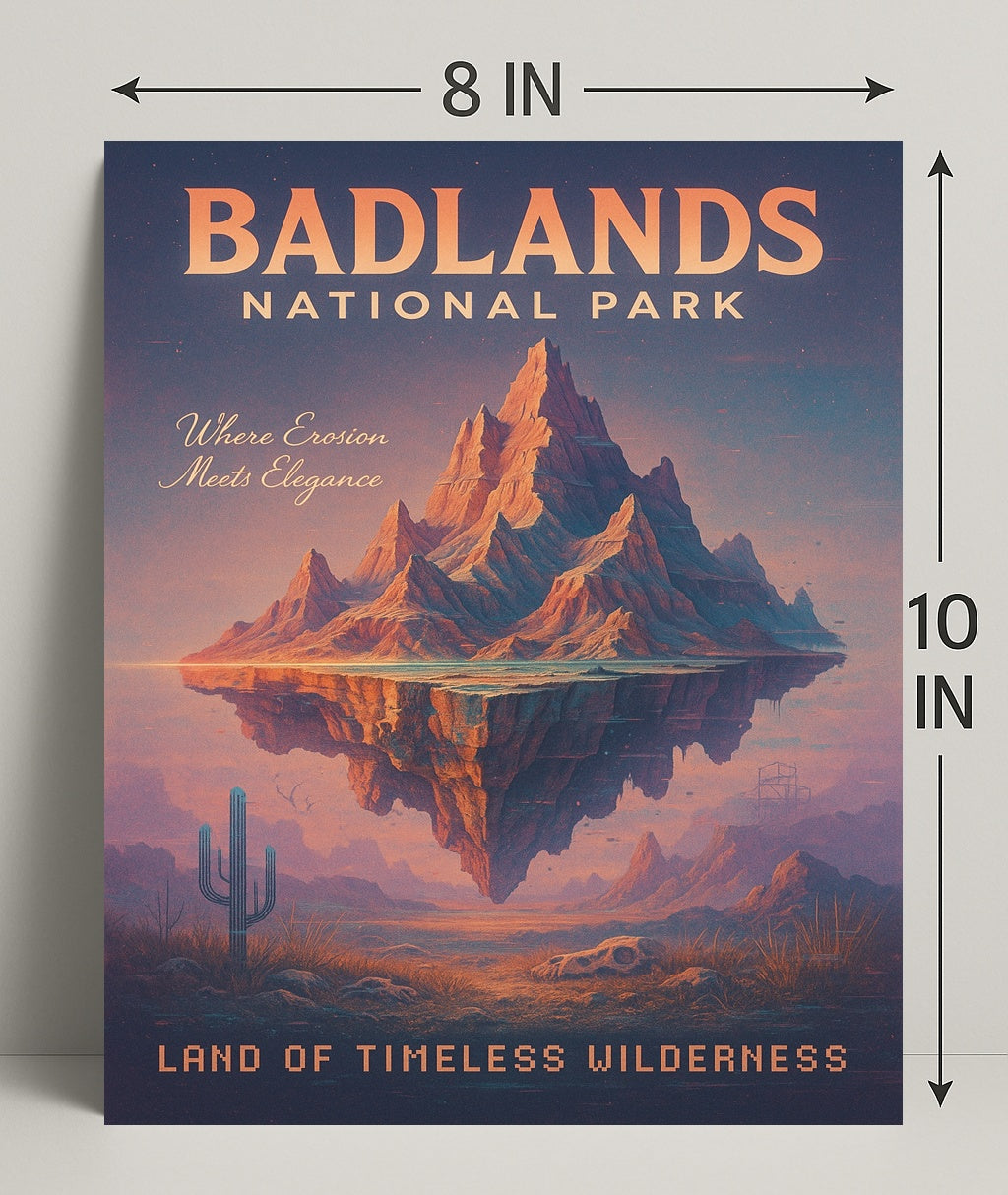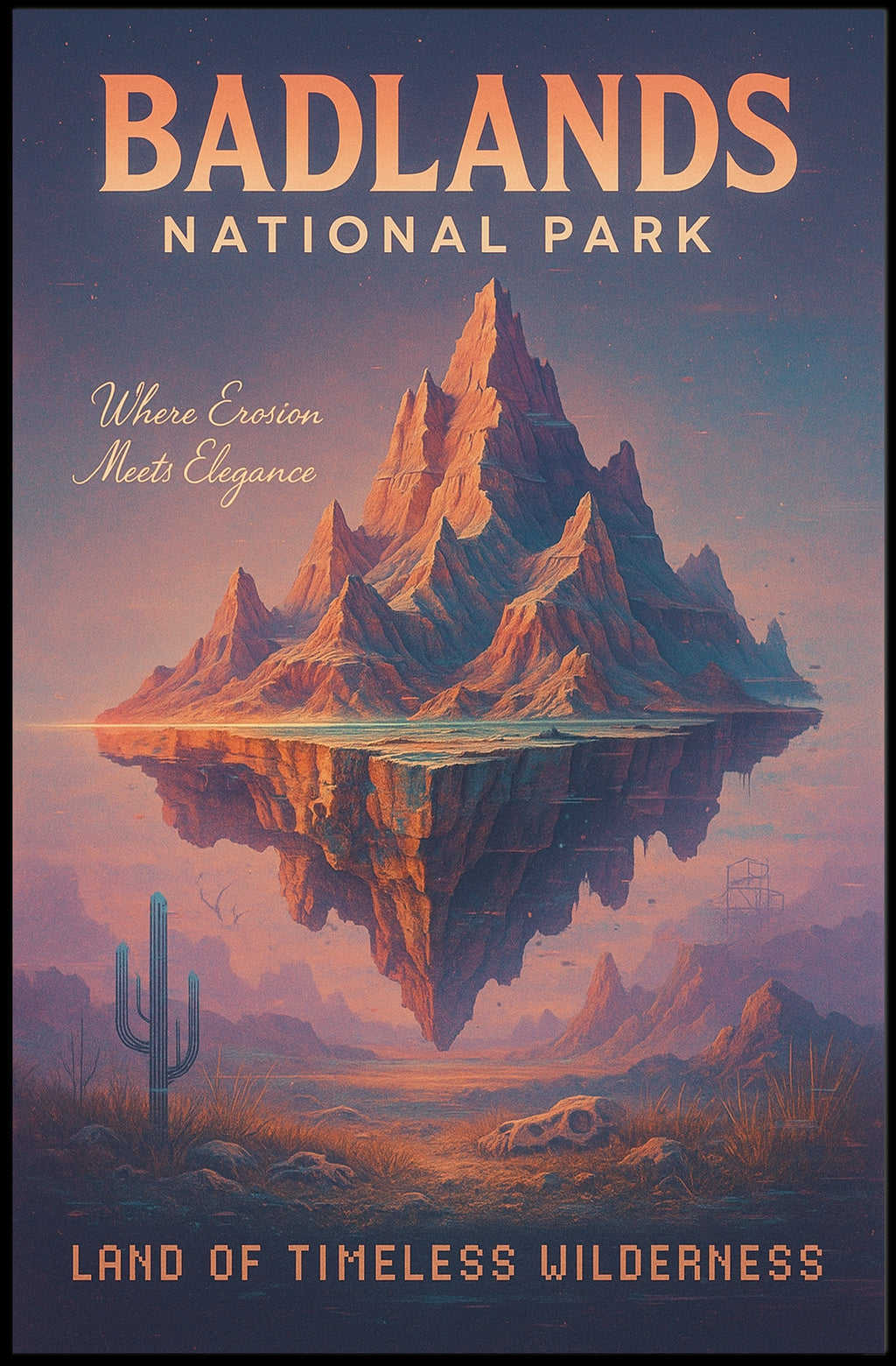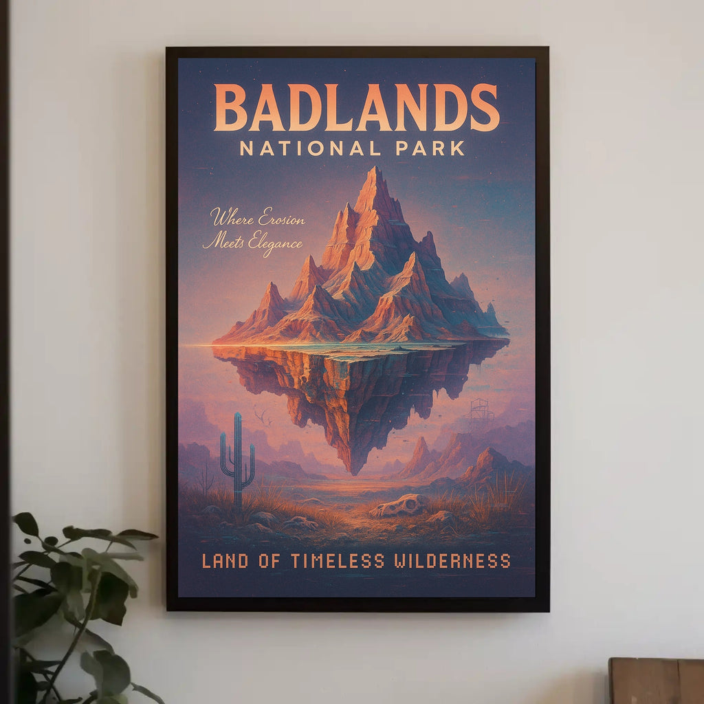 Bring the dramatic beauty of the American West into your home with the Badlands National Park — Land Of Timeless Wilderness poster from PosterGoat. This evocative art print combines vintage travel-poster typography with a surreal, floating rock formation, warm sunset tones and delicate desert details (cactus, skull, distant buttes) to create a timeless centerpiece for any room.