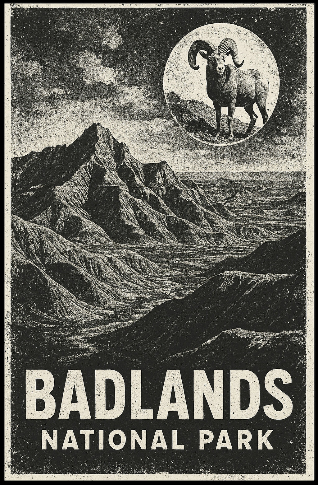 - Detailed design highlighting the dramatic eroded formations and sweeping horizons of the Badlands