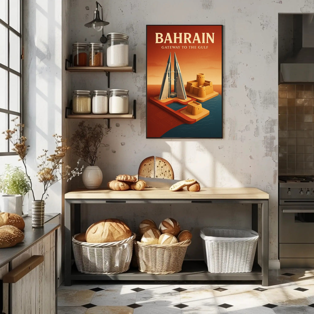 Celebrate Bahrain's unique blend of past and present with the "Bahrain — Gateway to the Gulf" poster from PosterGoat. This photorealism-inspired artwork pairs the island’s iconic twin towers with historic fort architecture on a warm, earthy palette that instantly elevates any wall. The composition captures architectural fusion and cultural heritage in a single, striking cityscape—perfect for home, office, or travel-inspired decor.