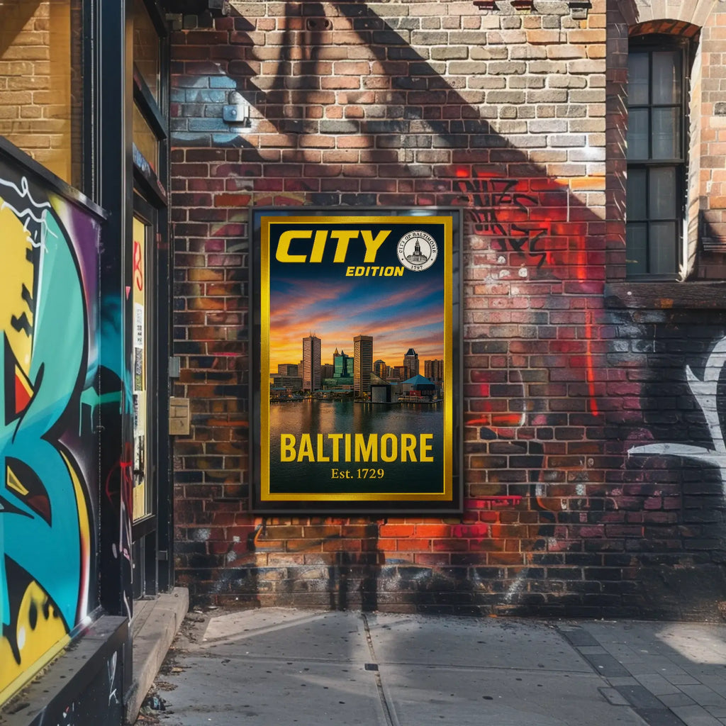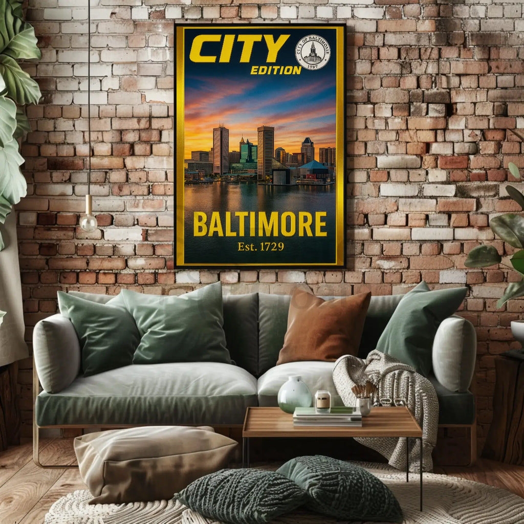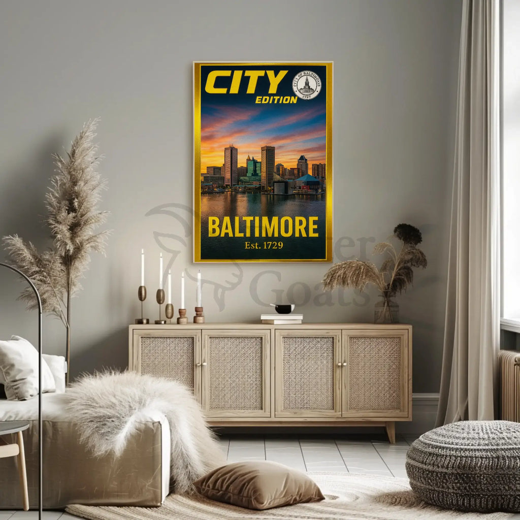 Why you'll love it: The sunset palette and reflective harbor waters bring warmth and depth to your wall, while the strong “CITY” and “BALTIMORE” lettering adds classic travel-poster appeal. This piece celebrates city pride and urban development in a refined, gallery-ready print that complements contemporary and classical decor alike.