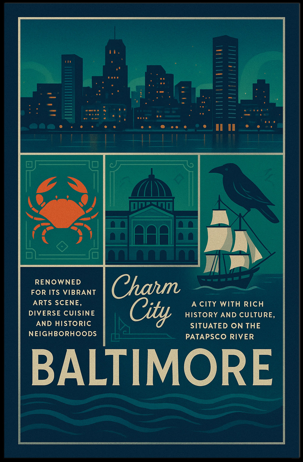 Distinctive graphics: Eye-catching panels showcase Baltimore’s crab iconography, historic architecture, a tallship and riverfront silhouette for layered visual storytelling.