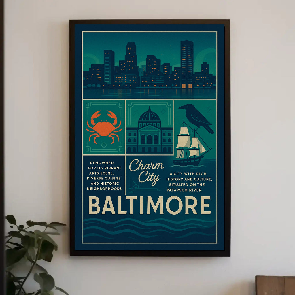 Bring Baltimore's iconic spirit into your space with the Baltimore Vintage Charm Travel Poster by PosterGoat. This Artisanal Prints–inspired poster blends retro travel-poster style with modern pop-art sensibilities, featuring a moody teal and navy skyline, classic waterfront waves, and bold graphic vignettes—a crab, historic dome, sailing ship and raven—that celebrate Charm City's maritime heritage and cultural history.