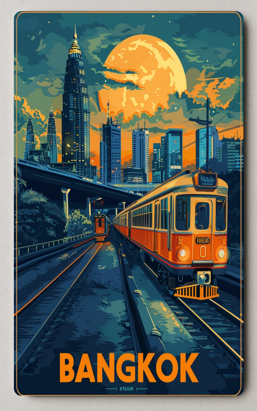 Capture the pulsing energy of Thailand’s capital with the PosterGoat Bangkok Cityscape With Vintage Train Urban Trading Card — a striking pop-art collectible that pairs retro transit charm with a modern skyline. This illustrated trading card celebrates Bangkok’s iconic urban silhouette and the nostalgic appeal of a vintage train cutting through the city under a dramatic moonlit sky.