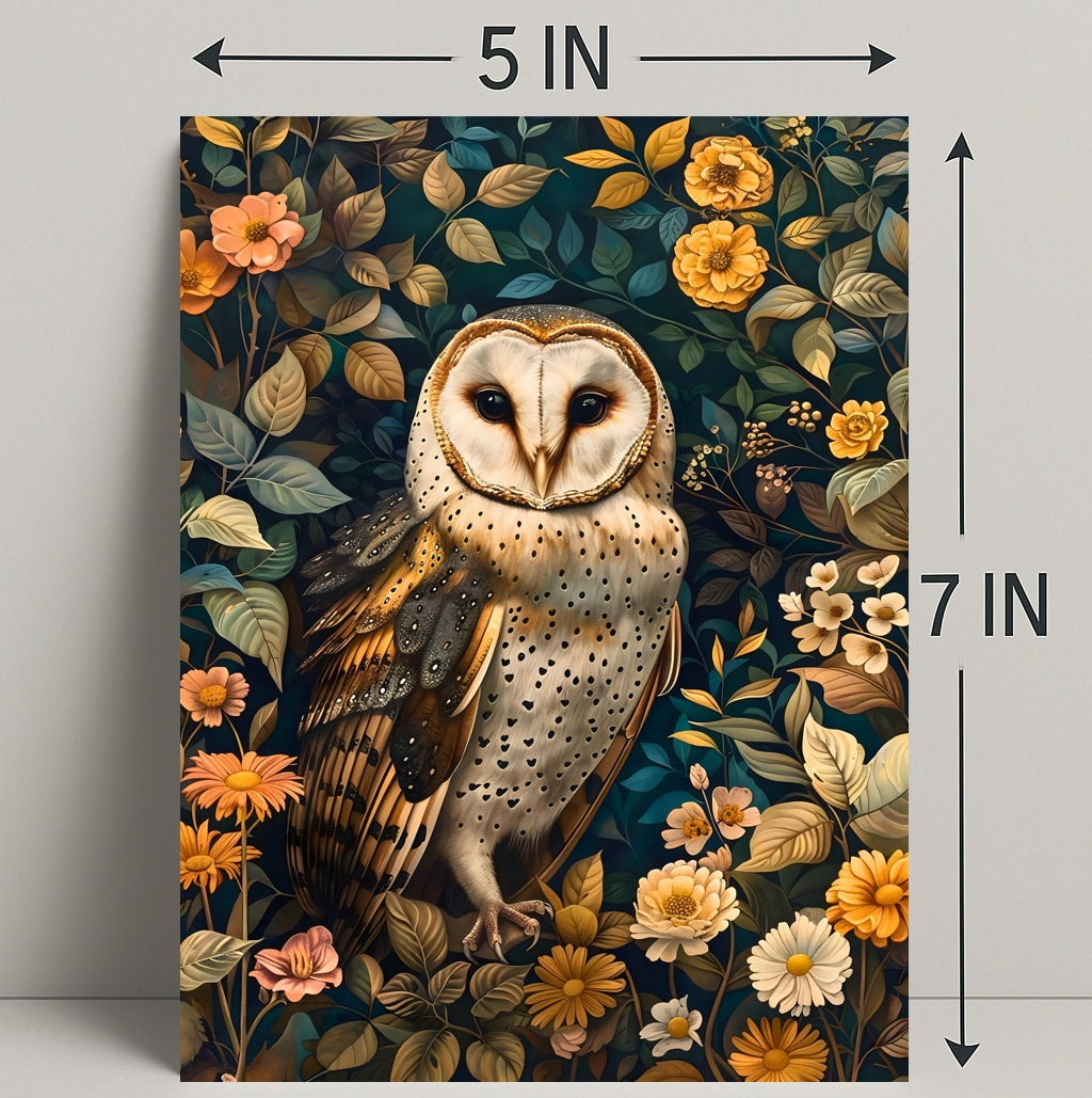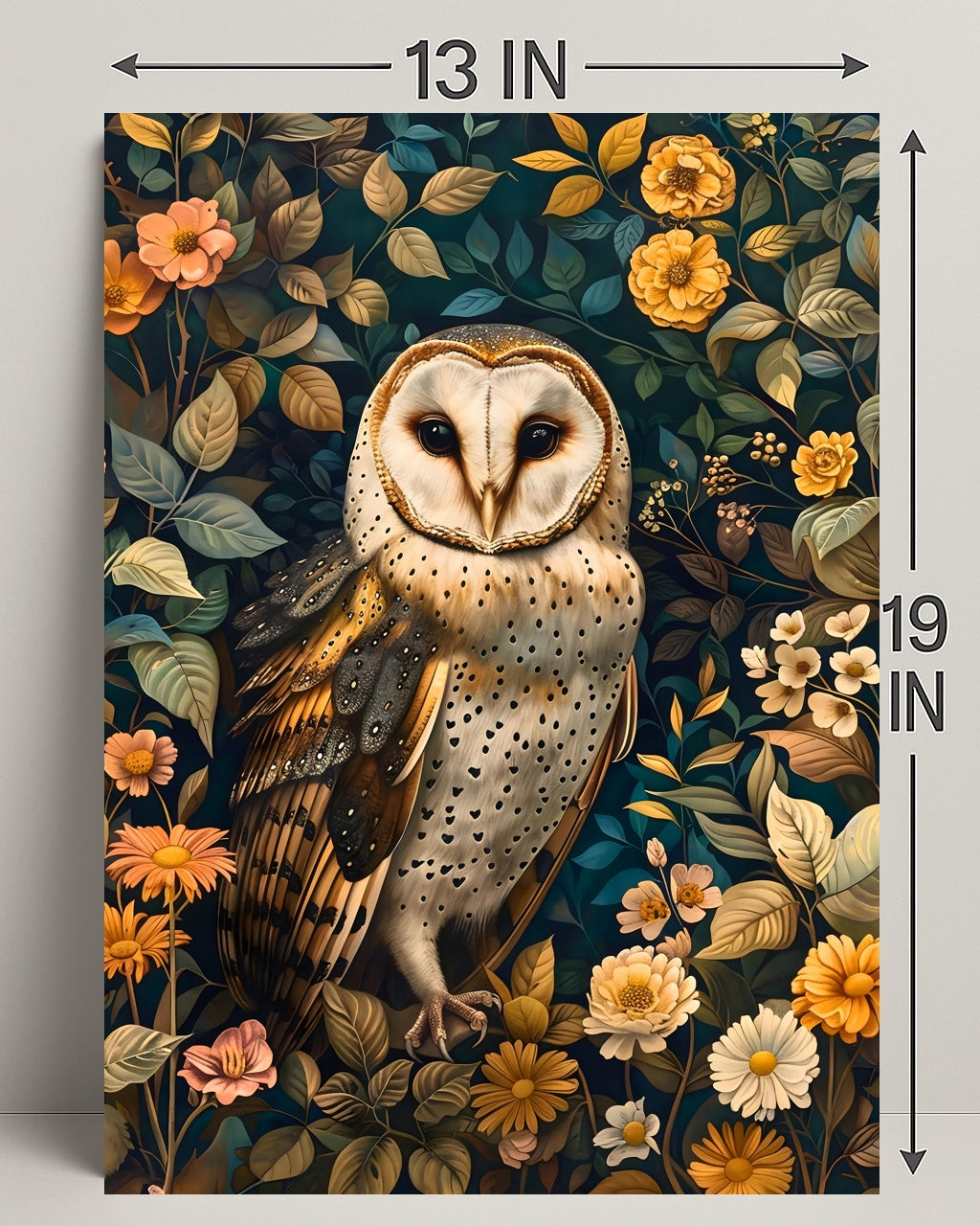Why you'll love it: The illustration showcases exquisite detail in the owl’s feathers, delicate heart-like spots, and deep, soulful eyes set against a rich teal backdrop. Golden and amber blooms weave around the bird, creating a warm, harmonious palette that complements modern and classic interiors alike.