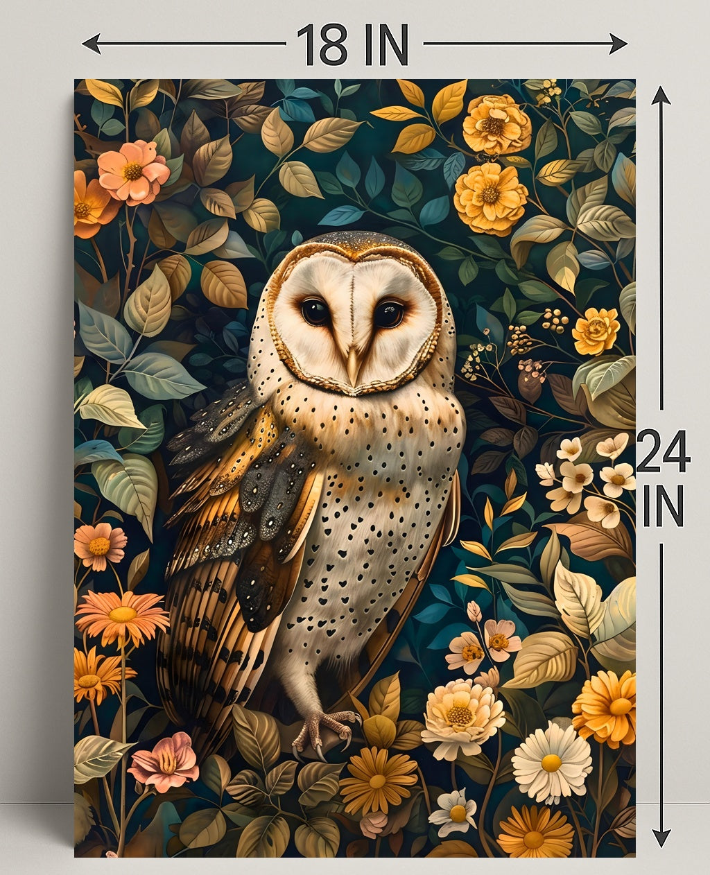 Style tags: animal art, barn owl art, floral tapestry, fantasy style, vintage art.