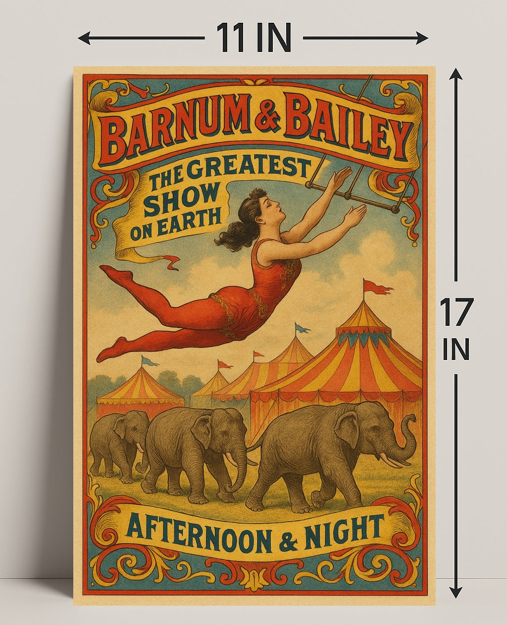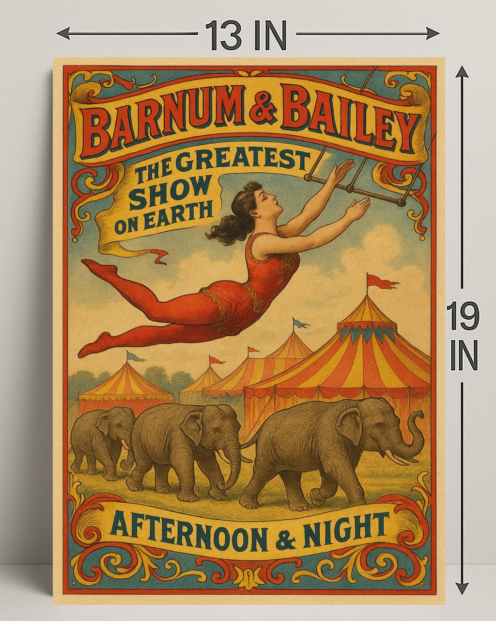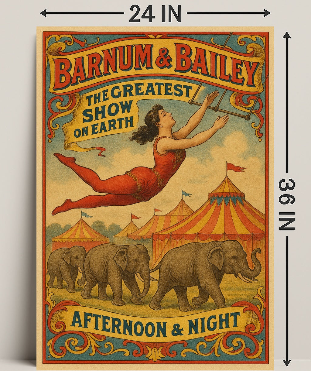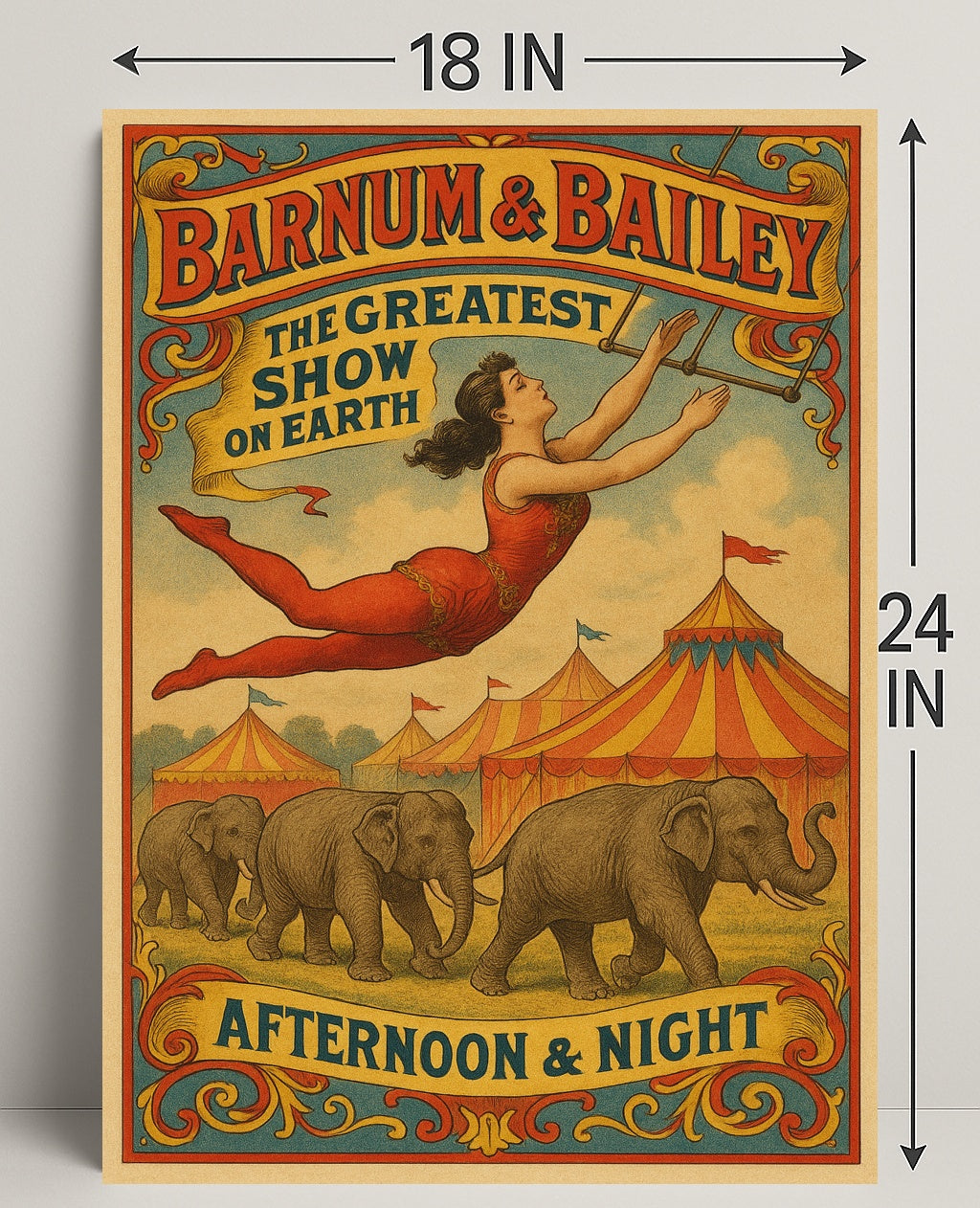 Bring vintage circus wonder to your walls with the Barnum Bailey "The Greatest Show on Earth" poster from PosterGoat. This striking art print captures a skillful trapeze artist in mid-flight above a parade of elephants and classic striped tents, rendered in warm, nostalgic tones and ornate lettering that instantly evokes the golden age of the showman. Perfect for living rooms, home offices, nurseries, or gallery-style displays, this poster adds bold, scenic character and a touch of historic charm to any decor.