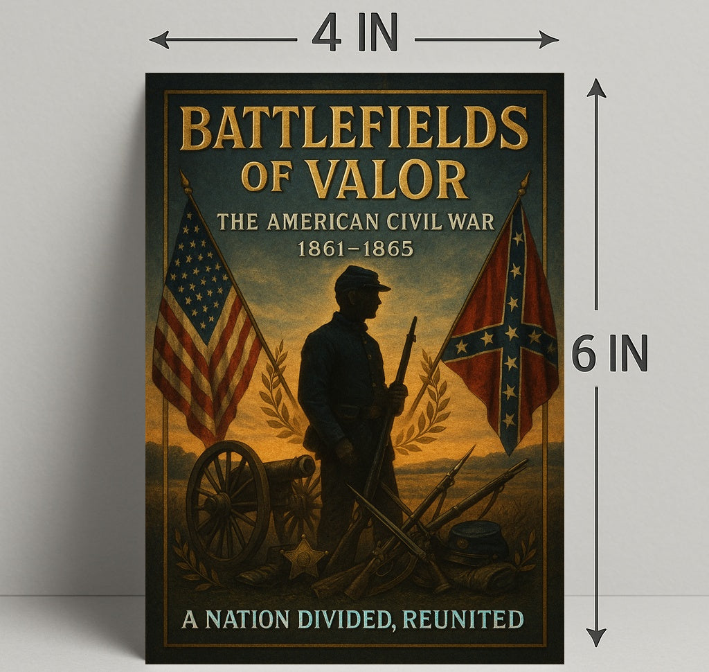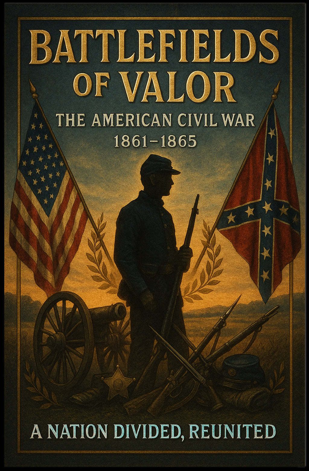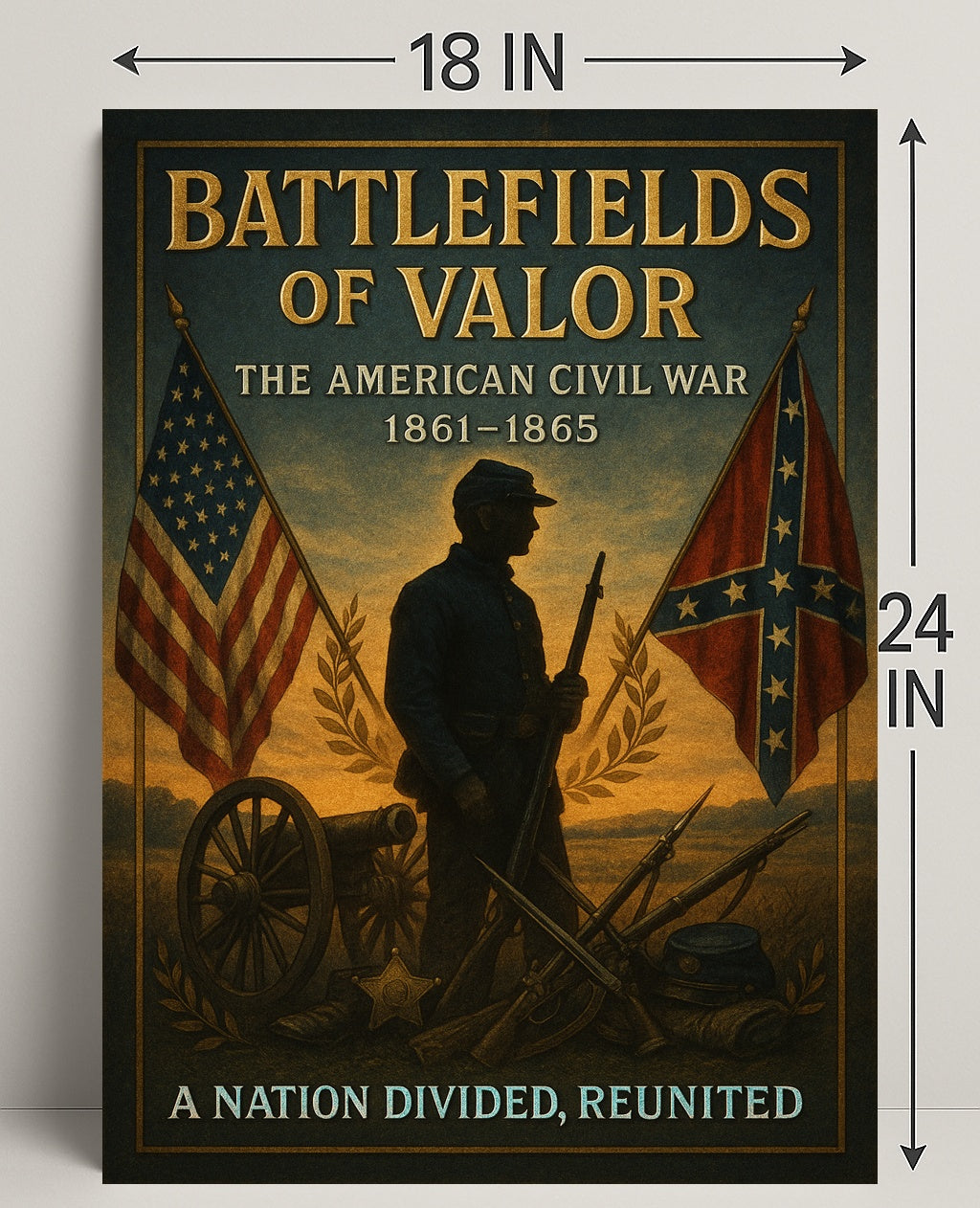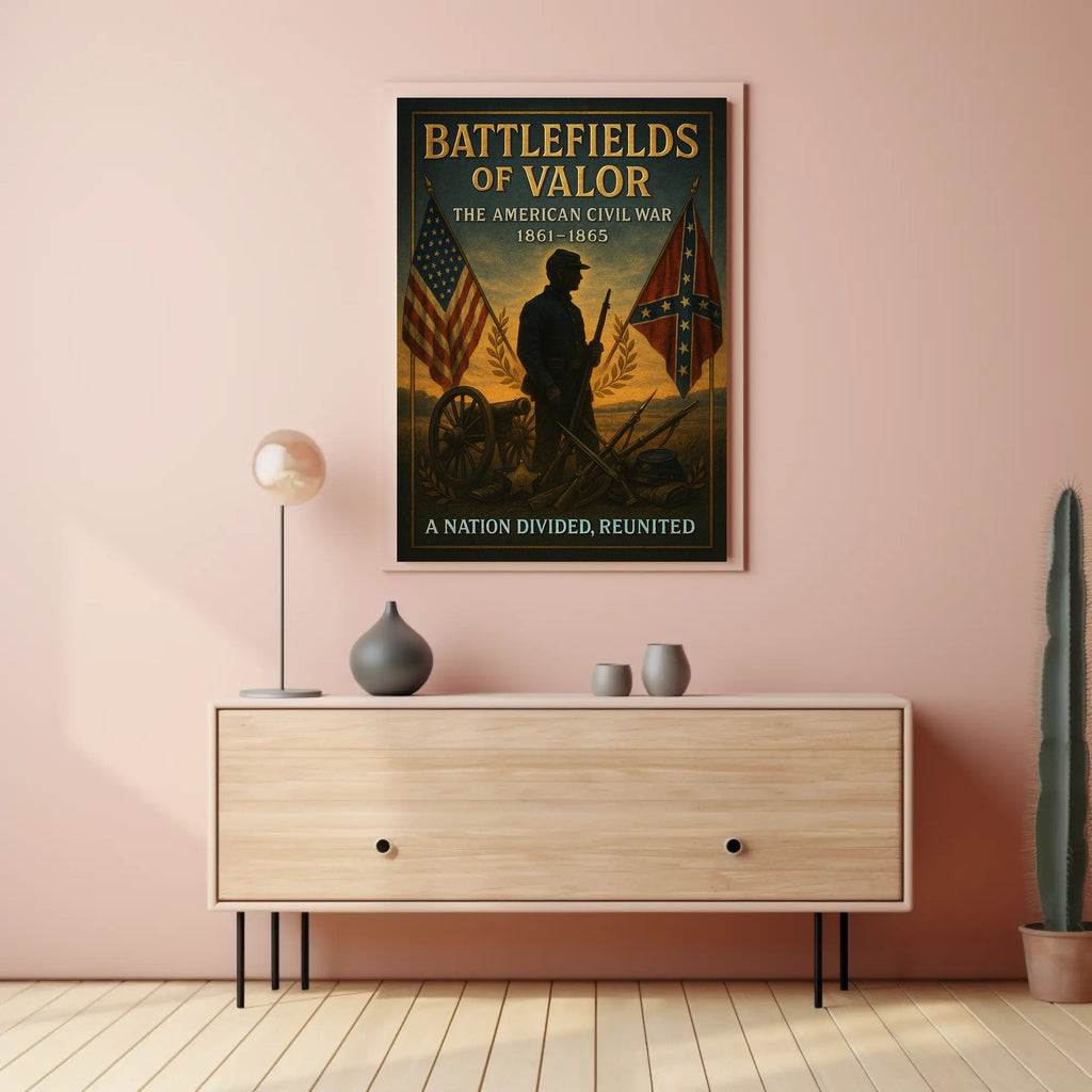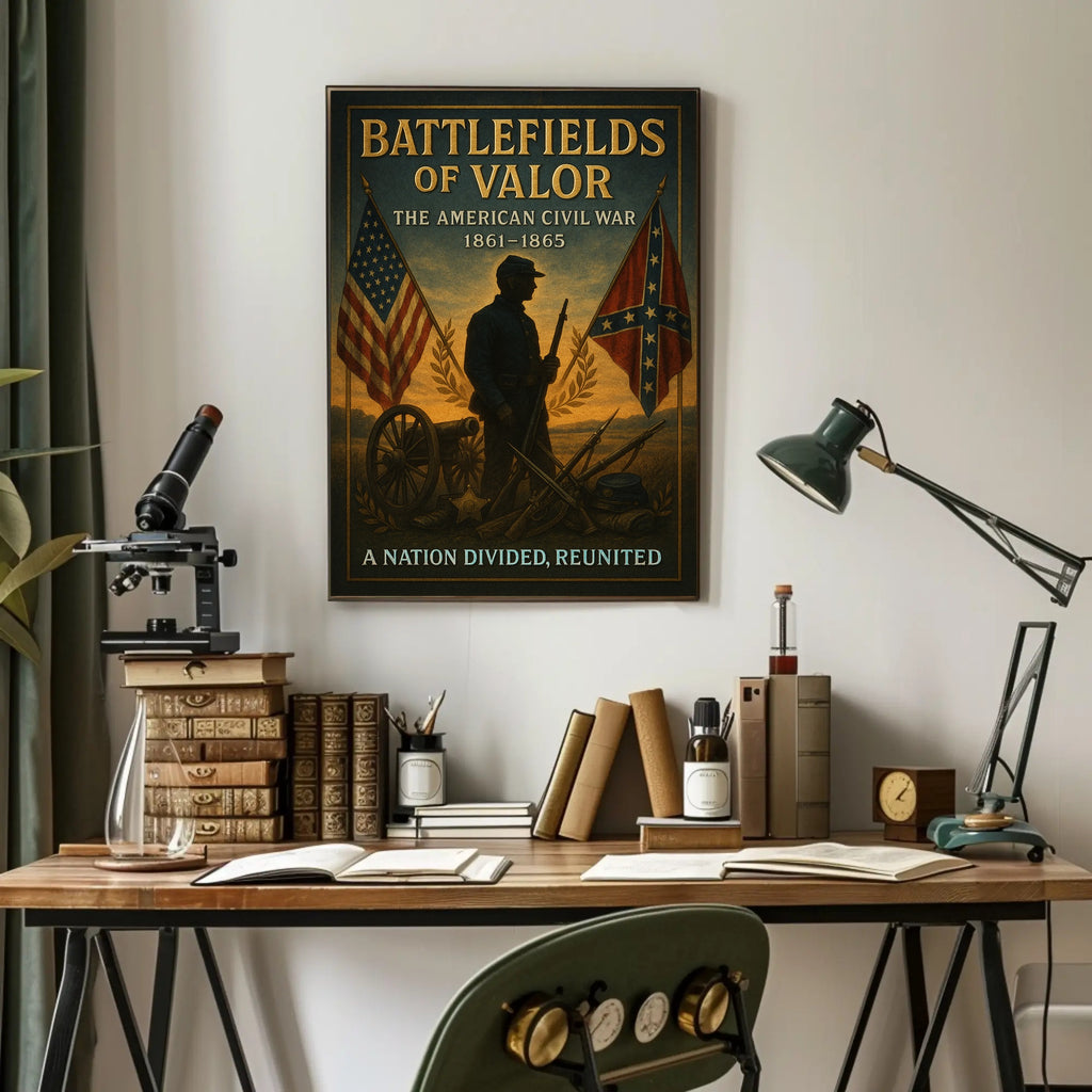 Battlefields of Valor — The American Civil War Poster by PosterGoat brings a stirring, museum-quality tribute to one of America's defining moments into your home. This richly detailed poster features a silhouetted Civil War soldier framed by the American and Confederate battle flags, a cannon wheel, stacked rifles and bayonets, and a laurel wreath—evoking honor, sacrifice, and the pathway to reunification.