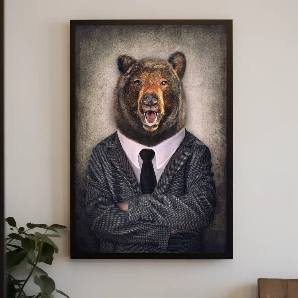 Bring humor, curiosity, and bold personality to your walls with the "Bear in Business Suit" Artistic Poster from PosterGoat. This photorealistic, surreal print blends nature and corporate style—an expertly rendered bear head atop a crisply tailored suit with arms confidently crossed—creating a striking focal point for home offices, modern living rooms, or corporate spaces.