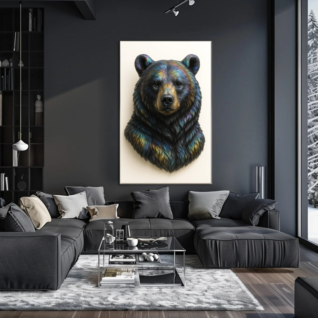 This piece works equally well as a bold focal point above a console or as part of a layered gallery wall — its neutral background and luminous accents make it easy to style with wood, metal, or minimalist frames. Whether you're a wildlife enthusiast, modern art collector, or interior designer seeking a striking centerpiece, this bear art print adds personality and sophistication to any room.