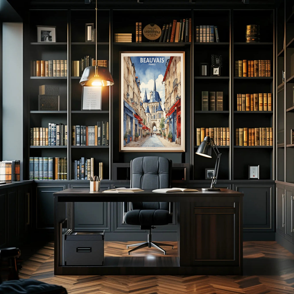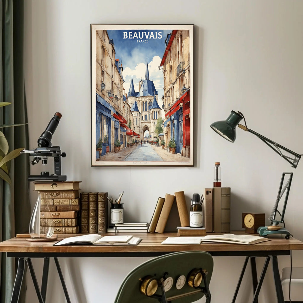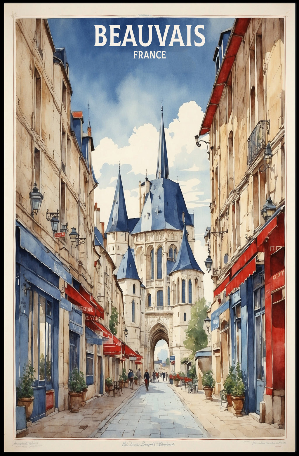 This enchanting poster captures the essence of Beauvais, a picturesque town in France, known for its enchanting blend of historical architecture and vibrant street life. The image invites you into a charming setting where pedestrians leisurely stroll past delightful storefronts, including a traditional "Boulangerie" and colorful cafes adorned with red and blue awnings. The cobblestone street leads the viewer’s gaze towards a majestic church or cathedral boasting impressive spires. Perfect for lovers of European architecture and urban charm, this artwork exudes a classic, quaint feeling that promises to enhance any space with its unique artistic value.