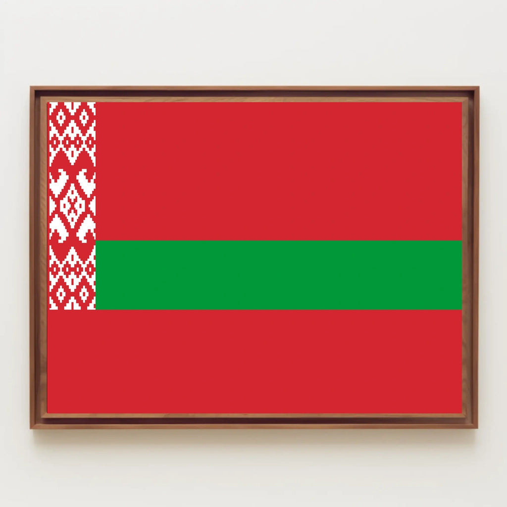 The flag of Belarus features a vibrant red and green horizontal bicolor design, symbolizing the nation's rich history and lush landscapes. The red stripe represents the sacrifices and bravery of the Belarusian people, while the green stands for the country's forests and fields. Along the hoist side, a traditional Belarusian ornamental pattern in white and red adds cultural significance, reflecting the nation's artistic heritage. This intricate design element highlights the importance of preserving national identity and pride. Perfect for those who appreciate cultural symbolism and historical depth, this flag poster is a striking representation of Belarusian heritage.