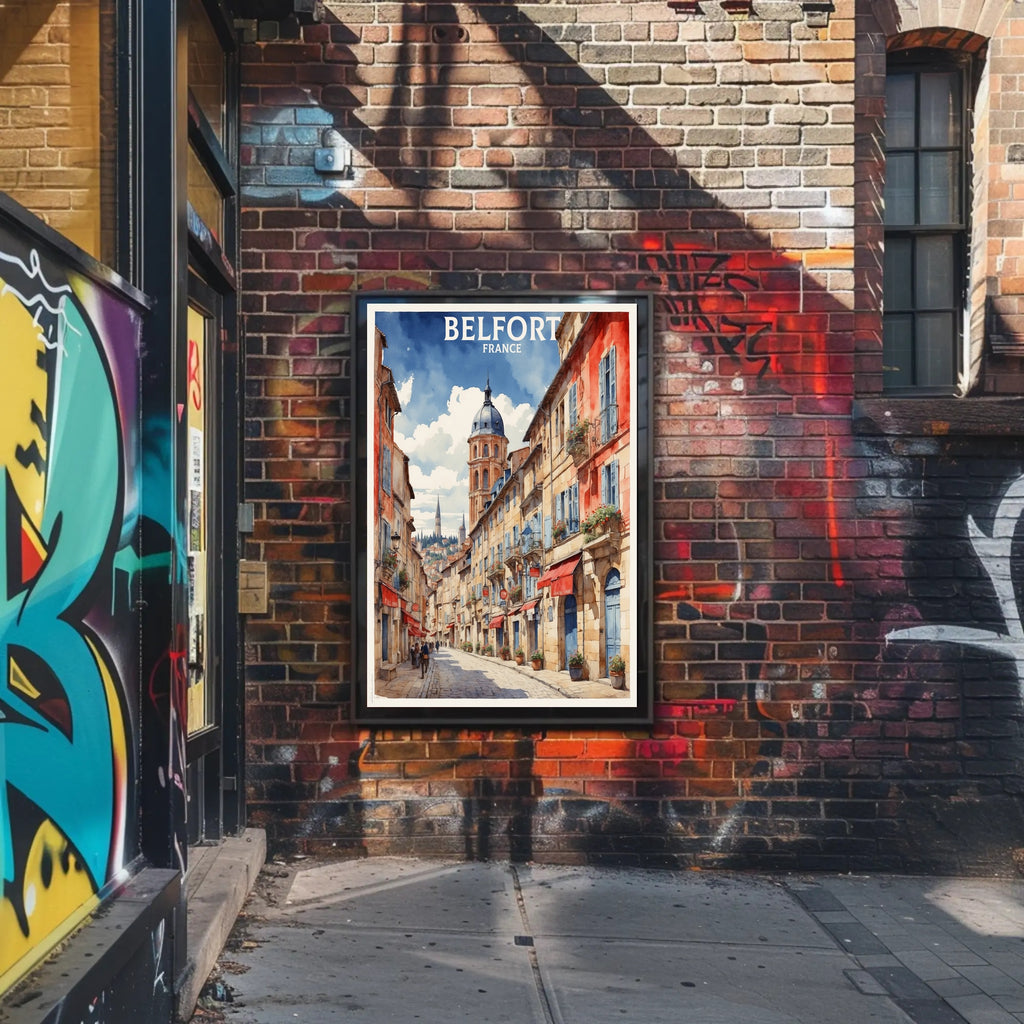 Capture the essence of a charming European town with this stunning poster featuring a picturesque street scene from Belfort, France. This artwork portrays a quaint atmosphere with narrow, cobblestone streets, lined with enchanting buildings adorned with vibrant red and blue shutters. Lush window boxes brimming with flowers animate the town’s lively spirit. The scene is captivating, with a domed tower rising prominently in the background, suggesting a historic landmark, while a distant spire hints at a traditional church. Perfect for travel enthusiasts or those who appreciate European charm and architectural beauty.
