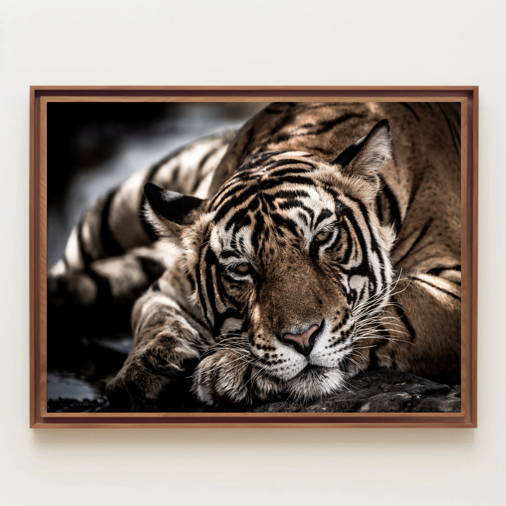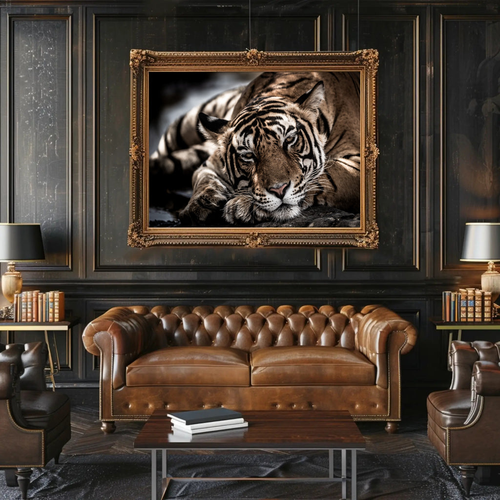 Capture the majestic elegance of the Bengal tiger with this stunning animal poster, featuring a breathtaking representation of India's and Bangladesh's dense jungles and lifelike wildlife photography. Immerse yourself in the vibrant colors and realistic details that depict the tiger's natural habitat, evoking a sense of awe and admiration. Perfect for nature enthusiasts, wildlife lovers, or anyone seeking to add an exotic touch to their space. This high-quality design brings nature's grandeur into your home, transforming your decor with an adventurous, captivating, and wild spirit. Experience the beauty of the jungle like never before.