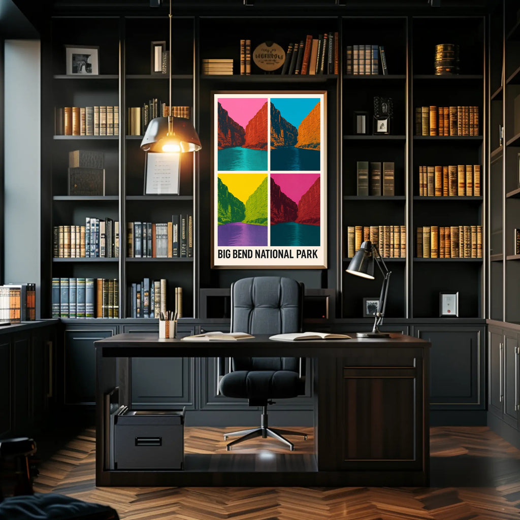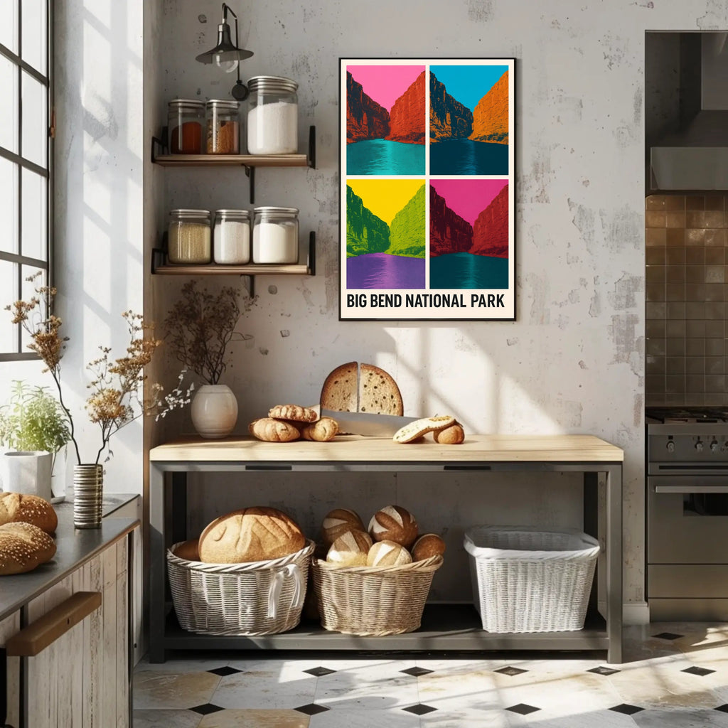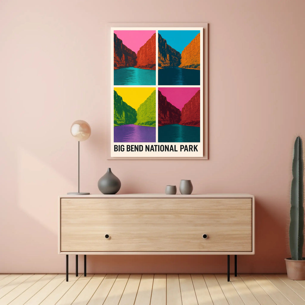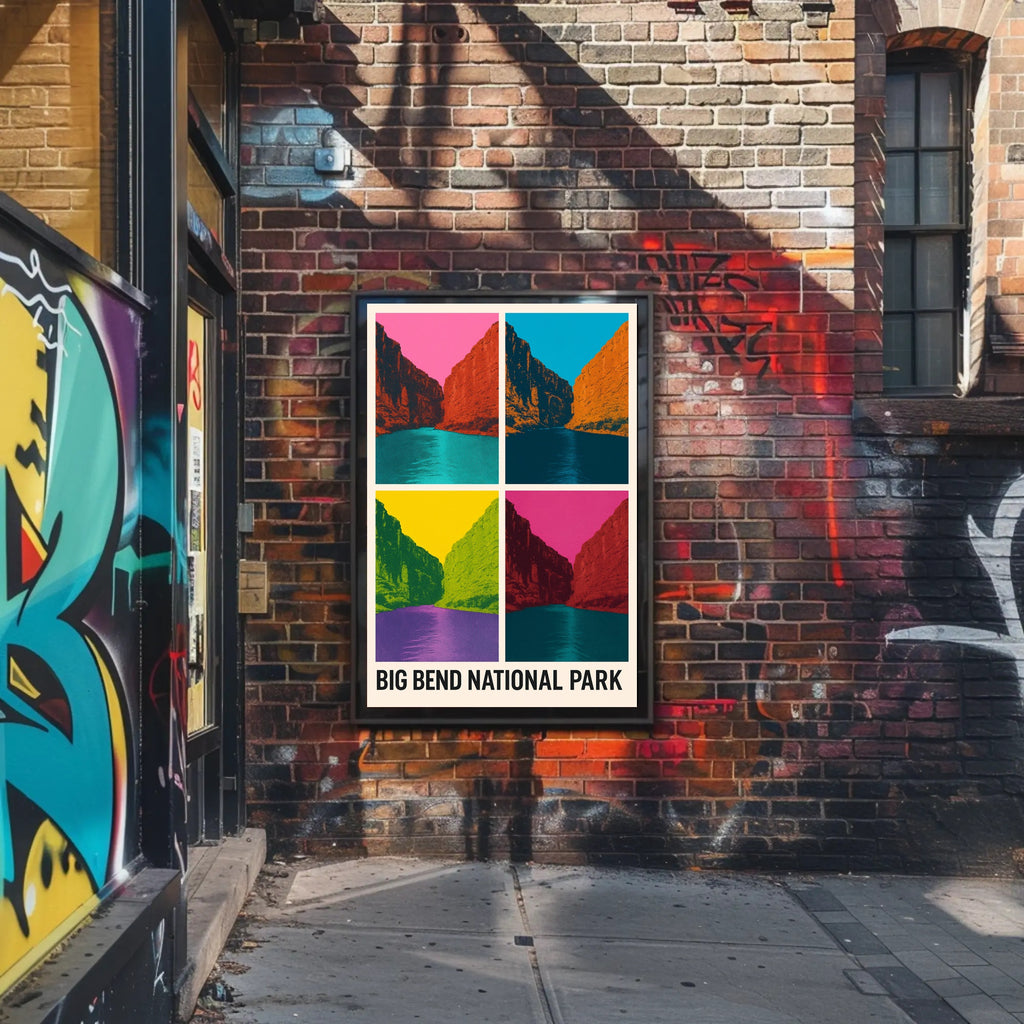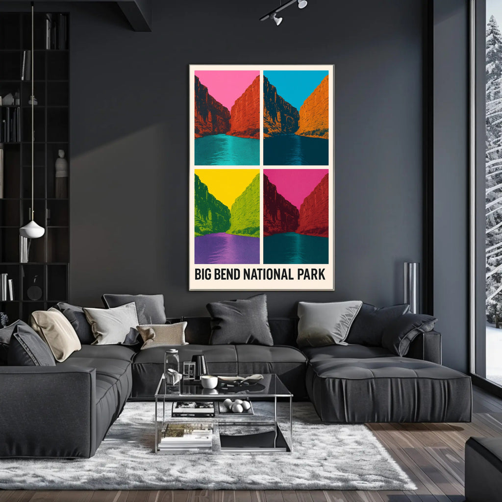 Big Bend National Park Poster from PosterGoat brings a bold, pop-art take on one of America's most dramatic landscapes — a four-panel celebration of canyon walls and winding river rendered in vibrant, retro halftone textures. This eye-catching poster pairs outdoor landscape inspiration with contemporary wall decor, perfect for living rooms, home offices, or travel-themed spaces.