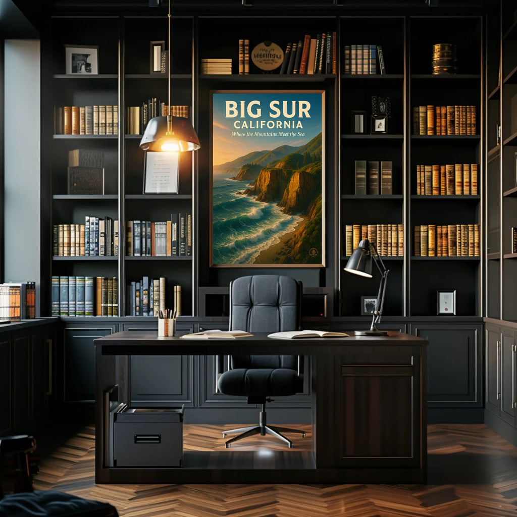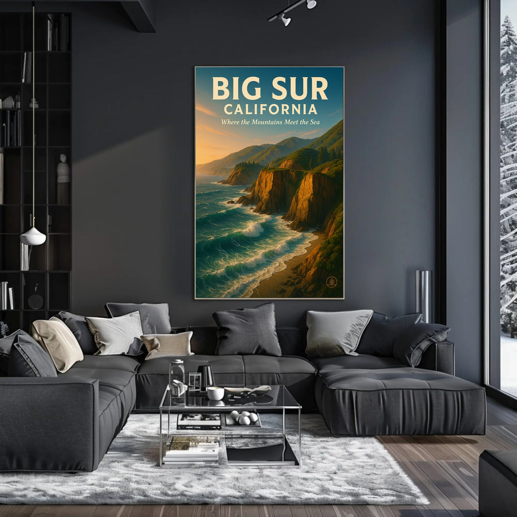 - Designed for impact: Bold vintage-inspired typography at the top reads “BIG SUR CALIFORNIA,” creating a classic travel-poster look that commands attention on any wall.