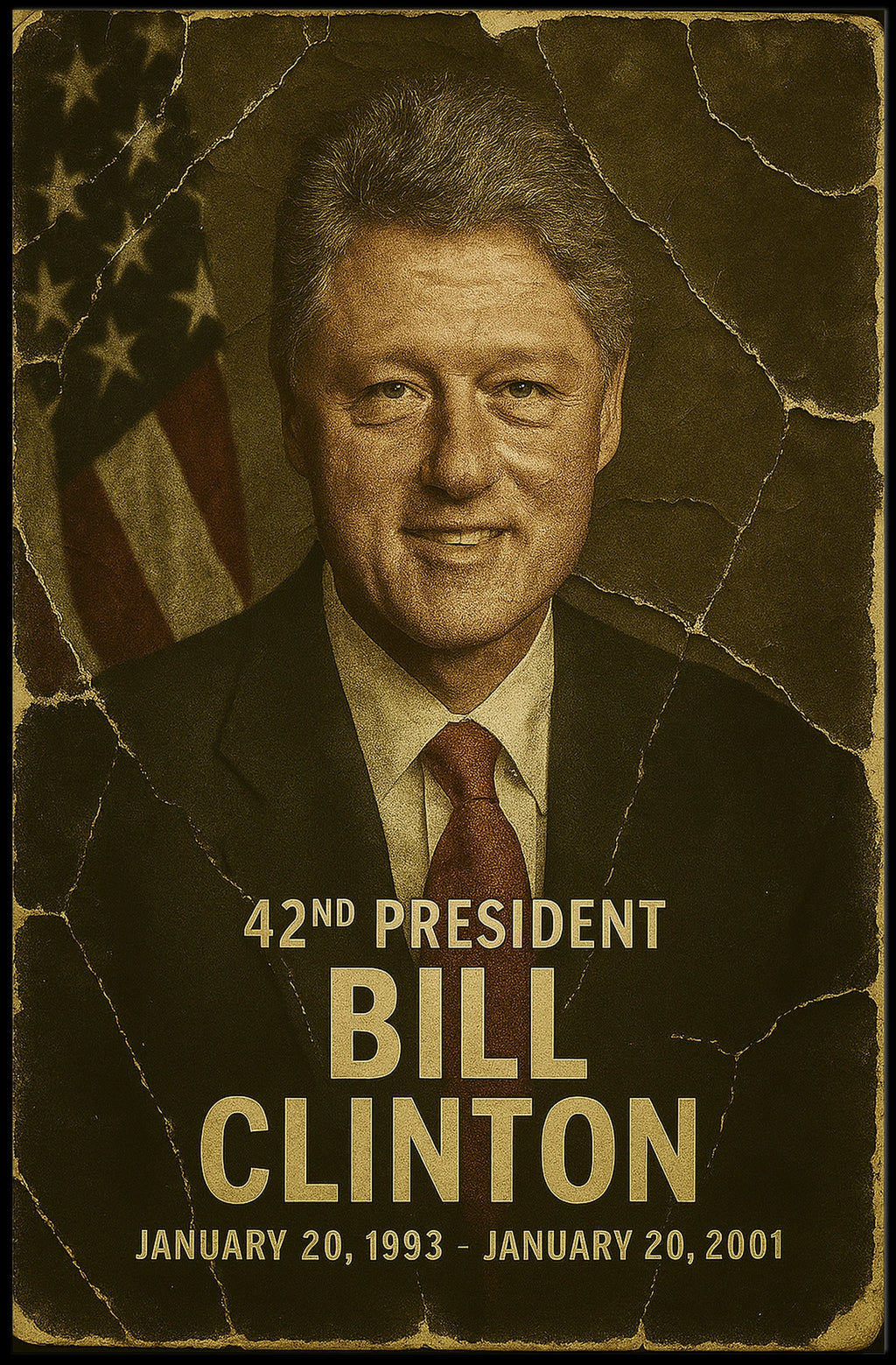 - Printed with precision and made to inspire, this artwork is more than decoration—it’s a conversation piece that connects history, culture, and style. Bring Bill Clinton, 42nd President of the United States Damaged Photograph Poster into your home, classroom, or office today and let your walls tell a powerful story.