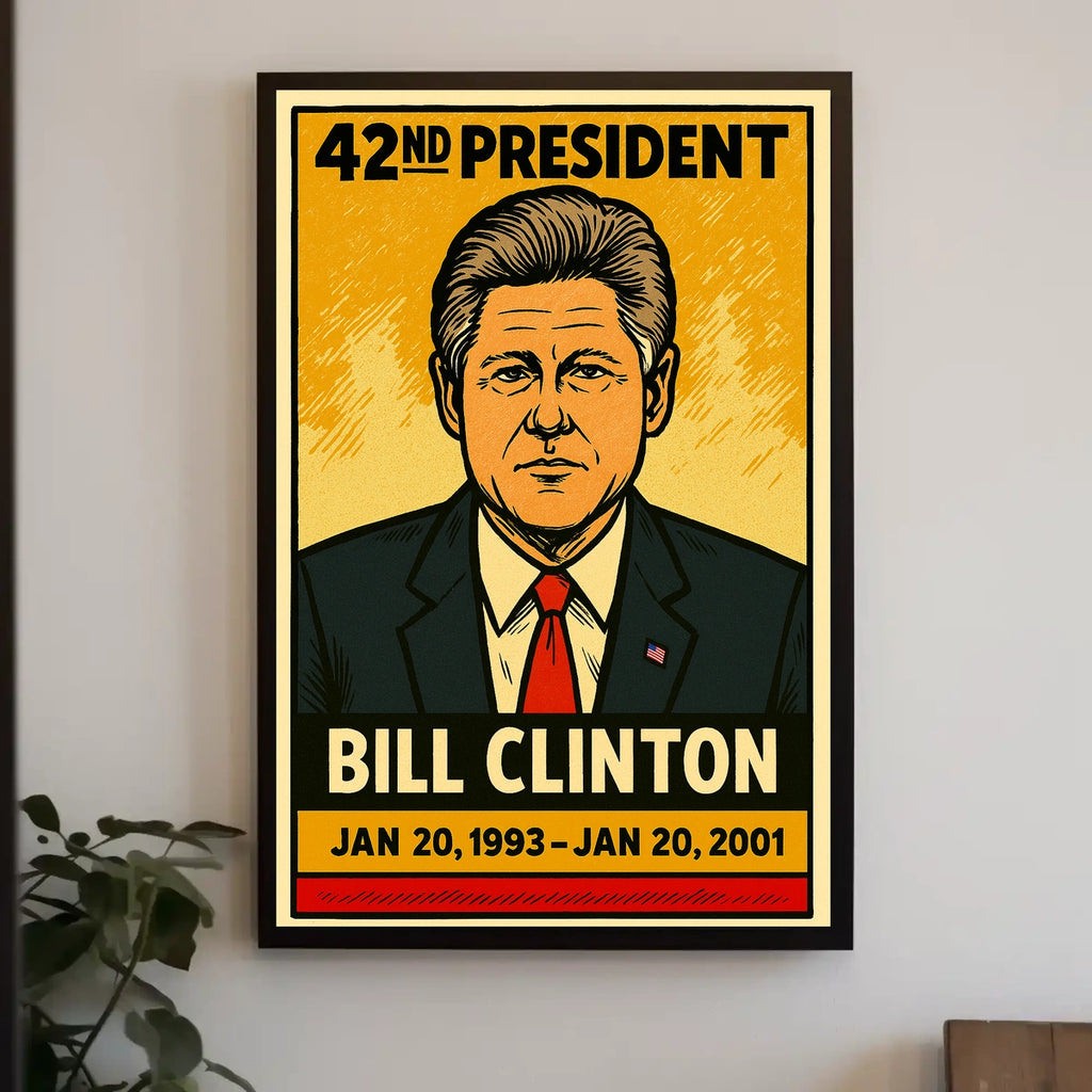 - Printed with precision and made to inspire, this artwork is more than decoration—it’s a conversation piece that connects history, culture, and style. Bring Bill Clinton, 42nd President of the United States, into your home, classroom, or office today and let your walls tell a powerful story.