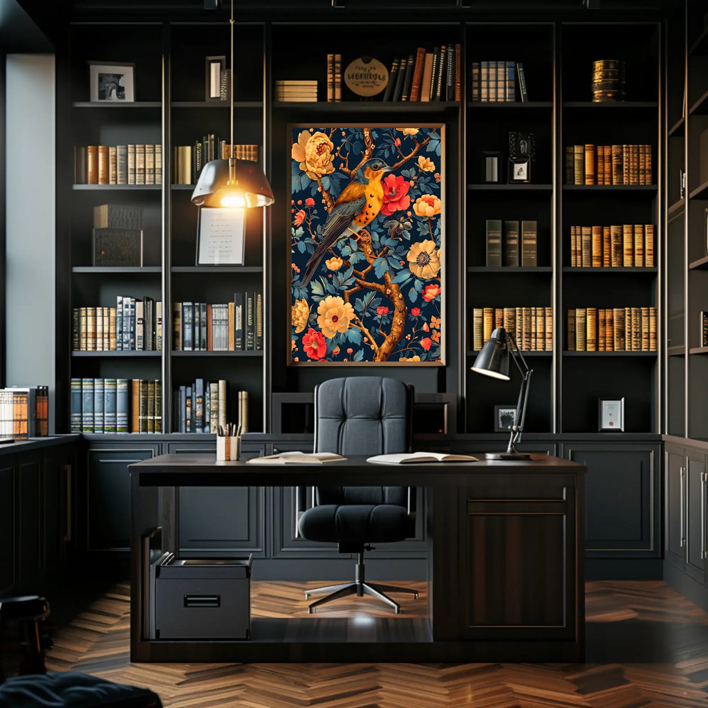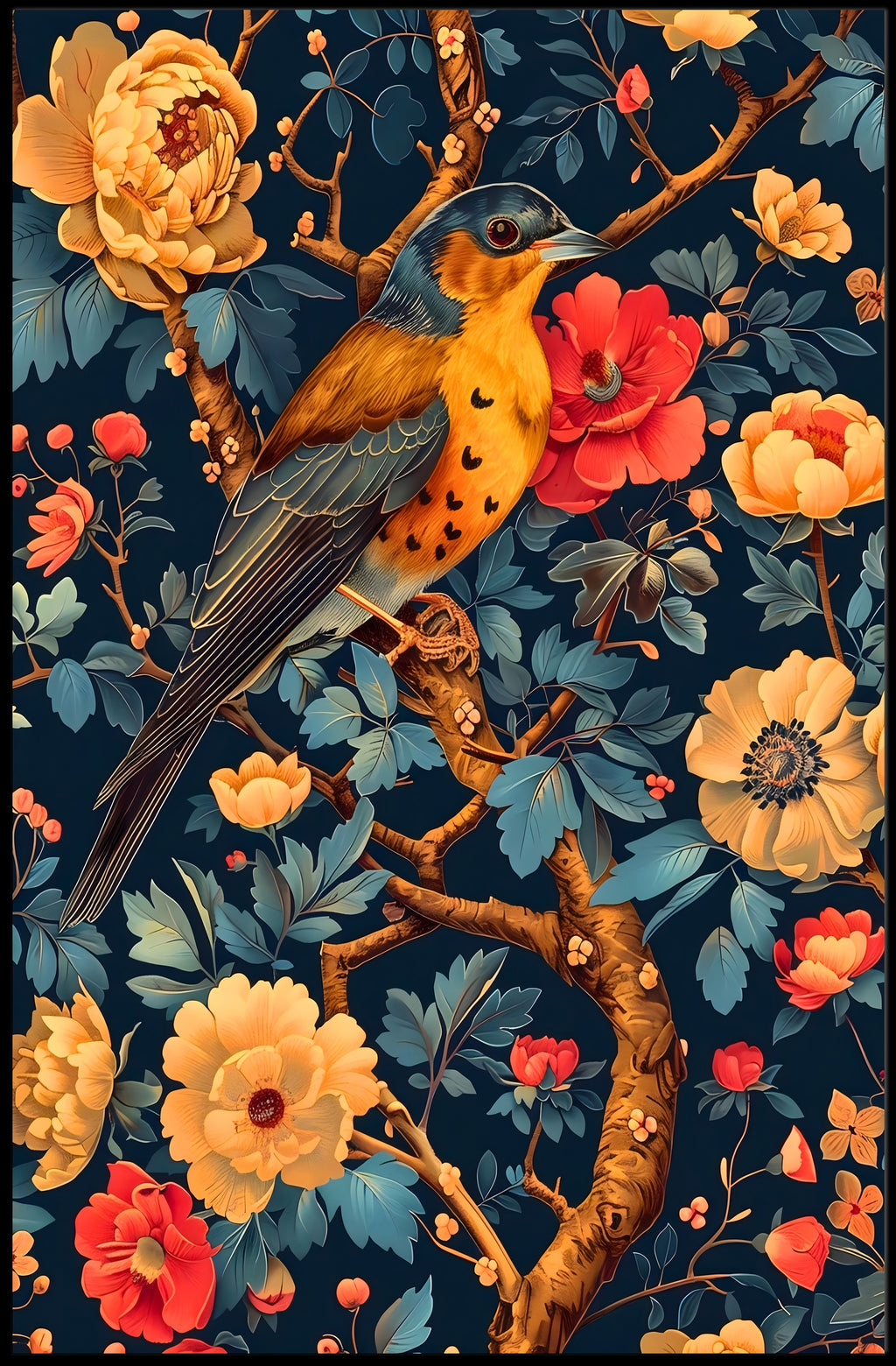 Immerse yourself in the vibrant and enchanting world of the Bird and Flower Botanical Art Print from PosterGoat. This beautifully illustrated poster features a striking bird with captivating yellow and blue plumage, perched in a stunning array of colorful blooms. The rich, dark background enhances the lush palette, making this piece a striking visual centerpiece for any room.