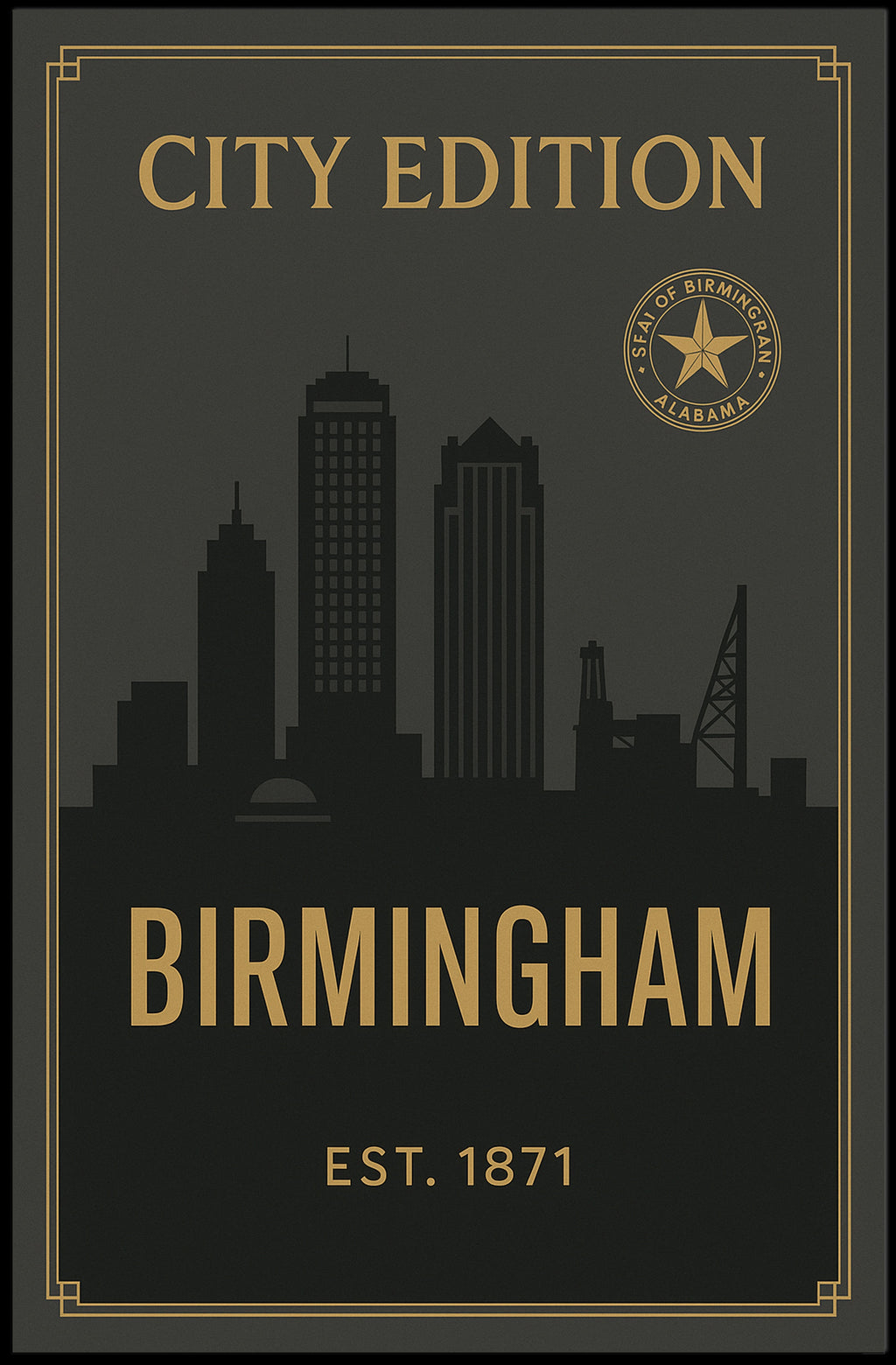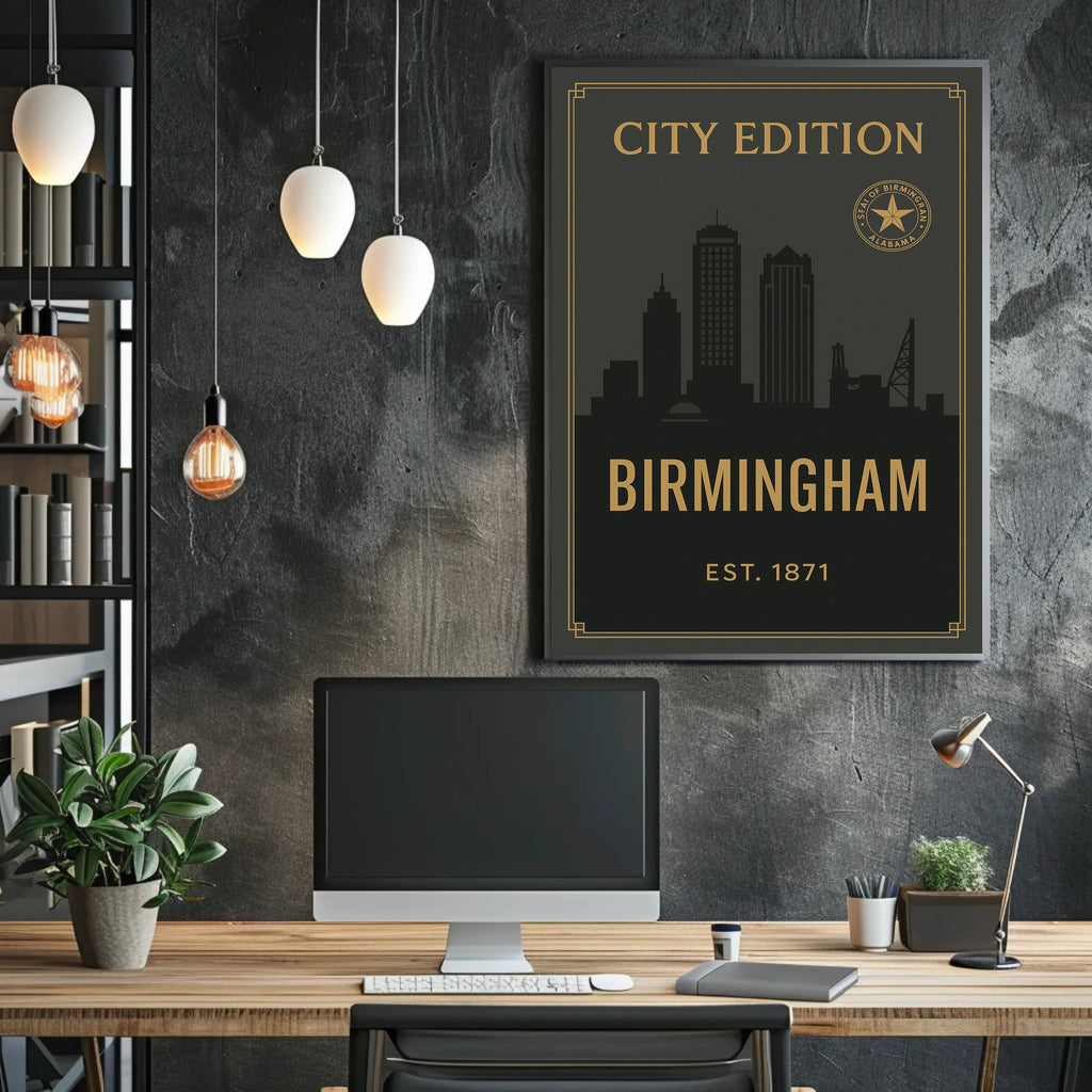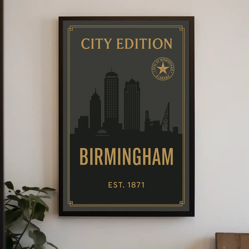 Designed for decor lovers, travelers, and anyone who appreciates curated wall art, this poster pairs effortlessly with contemporary and classic interiors. The deep charcoal background and contrasting gold details deliver an upscale, gallery-ready look while the bold “BIRMINGHAM” title and the “EST. 1871” mark give the piece a timeless, collectible feel.
