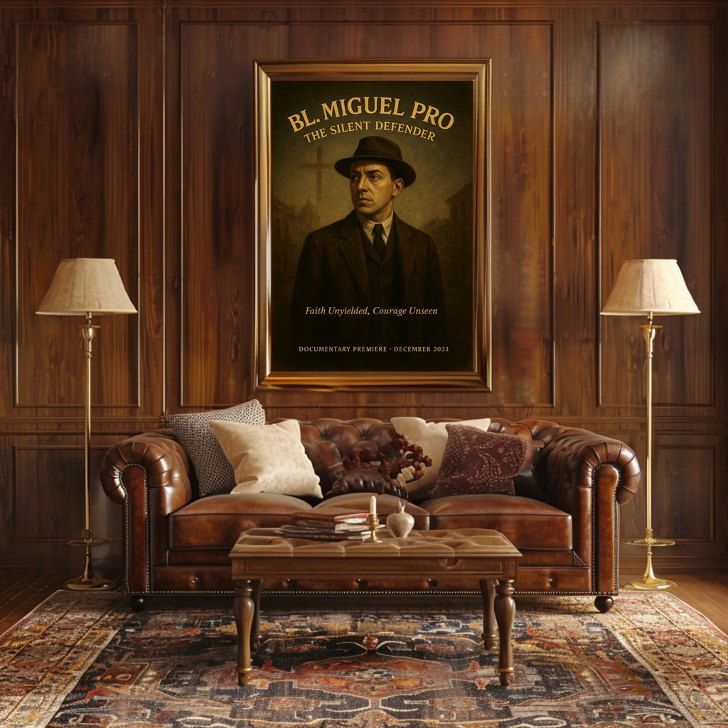 - Iconic imagery: A sepia-toned, painterly portrait of Bl. Miguel Pro in a period suit and fedora, rendered with rich, warm tones that create a timeless, contemplative mood.