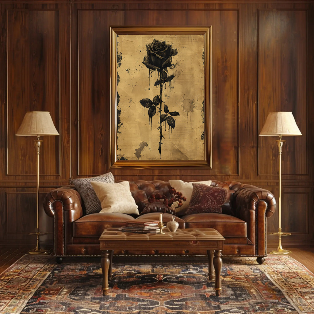 Why choose this poster? It blends botanical illustration with gothic storytelling — a collectible art piece that brings a somber, sophisticated mood without overwhelming a room. The textured background and ink-drip accents pair well with minimal, vintage, or dark-modern interiors.