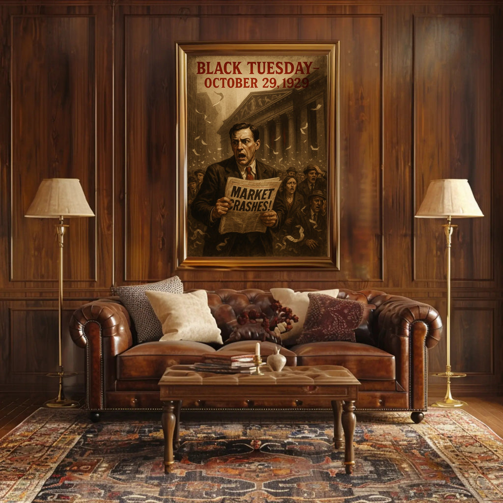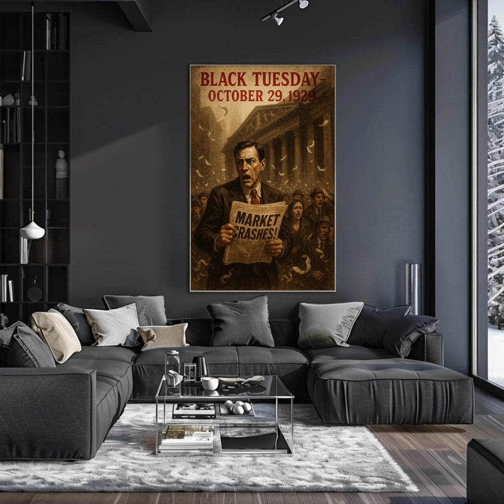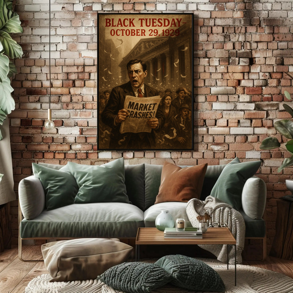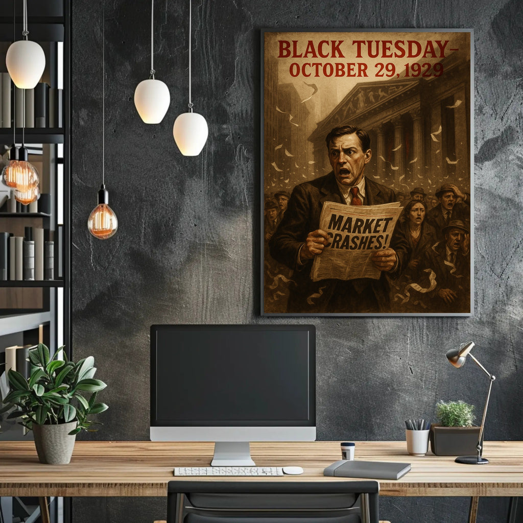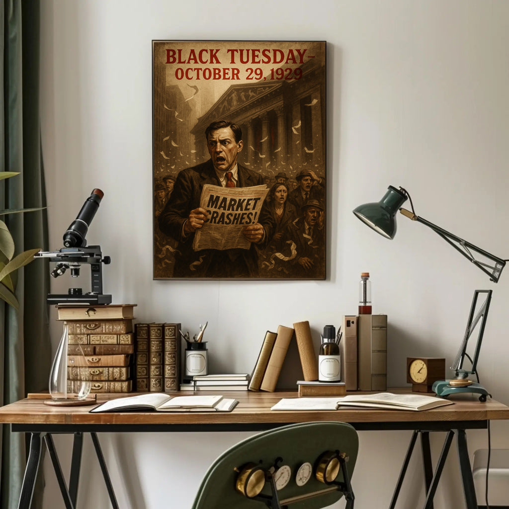 Step into a pivotal moment in history with the Black Tuesday Chaos Vintage Historical Poster by PosterGoat. This dramatic, sepia-toned art print vividly recreates October 29, 1929—showing a shocked man clutching a newspaper that screams "MARKET CRASHES!" against the columned facade of the stock exchange and a panicked crowd swirling with torn headlines. Perfect for history lovers, home offices, or gallery walls, this poster blends minimalist composition with powerful storytelling.