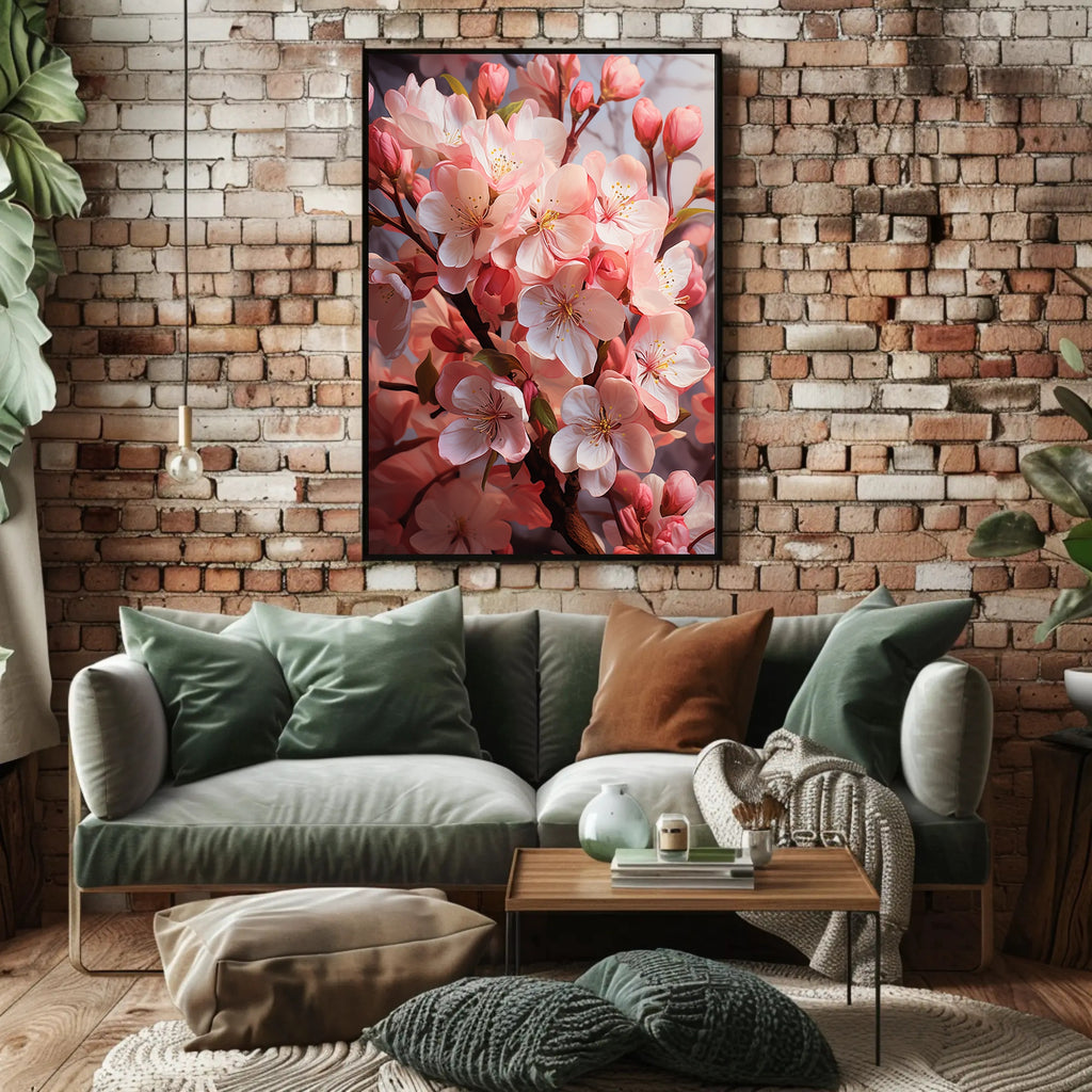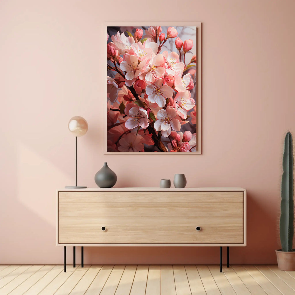 Invite the soft romance of spring into your home with the Blossoms In Bloom Poster from PosterGoat. This striking wall art showcases a close-up study of delicate pink blossoms—petals layered in soft blush tones, golden pistils catching the light, and buds poised on slender branches—rendered with a minimalist, artful aesthetic that instantly elevates any room.