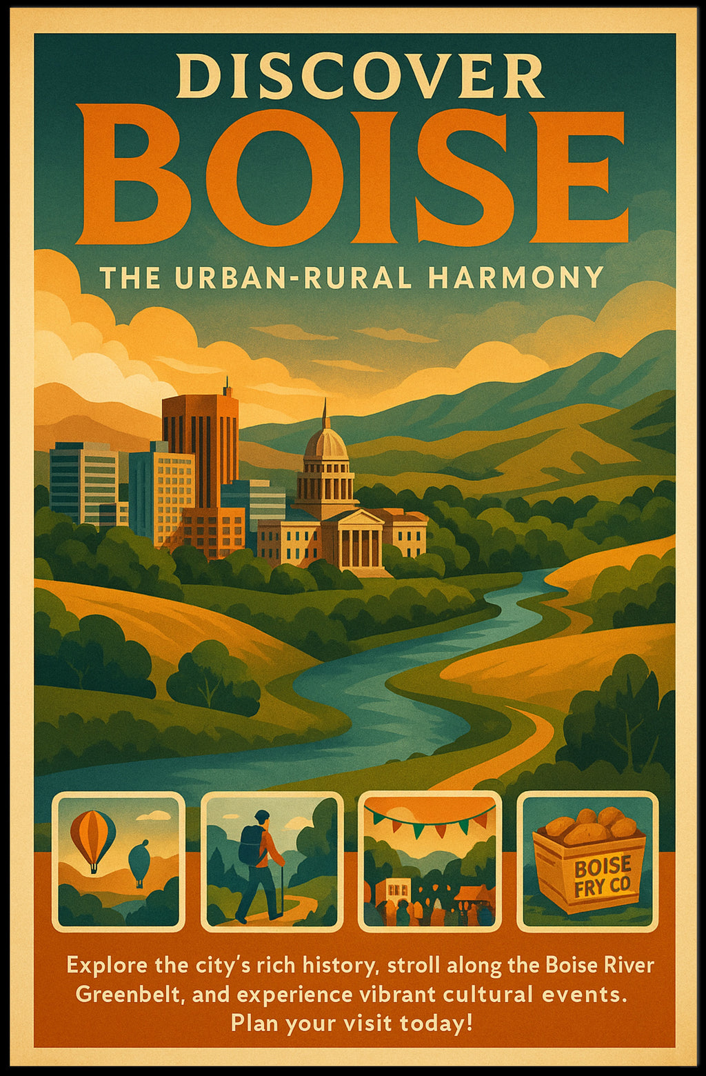 Boise Harmony: Urban and Rural Travel Poster by PosterGoat captures Idaho's capital in a nostalgic pop-art style — a scenic celebration of the Boise River Greenbelt, the Idaho State Capitol silhouette, rolling foothills, and the energetic cityscape framed in a warm, vintage color palette.