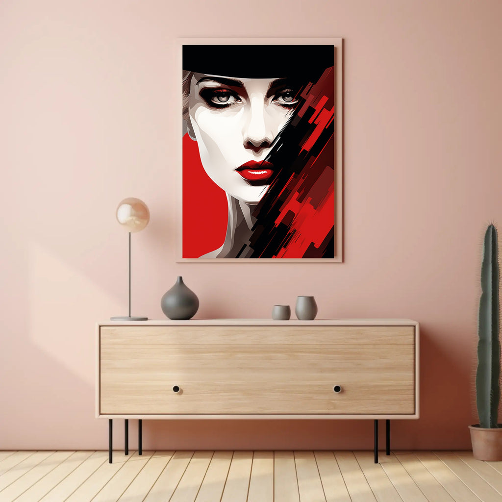 This artwork is perfect for home & garden decor lovers looking for standout posters, prints, or visual artwork to elevate living rooms, entryways, studios, or office walls. The composition pairs graceful facial features with dynamic, angular red accents—creating movement and depth while retaining a clean, gallery-ready silhouette.